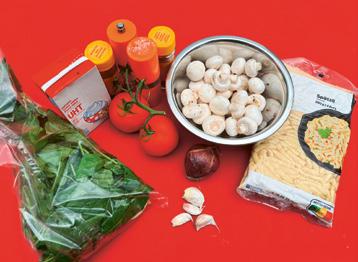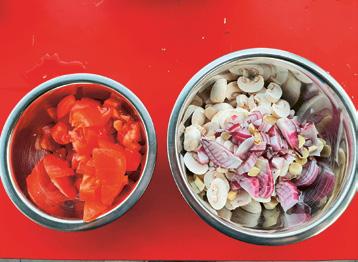 2. Coupez les champignons en tranches, puis pelez l’oignon et coupez-le en dés. Procédez de même avec les gousses d’ail. Mettez tous les légumes dans un plat. Coupez les tomates en deux et enlevez le coeur. Coupez les moitiés de tomates en dés grossiers et et réservez-les dans un saladier.