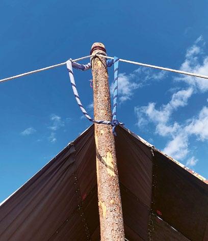 Les scout·e·s venaient de partout pour admirer cette construction : l’ouvrage a été réalisé par le groupe scout Isenringen Beckenried, dans le can ton de Nidwald. Une passerelle haute de huit mètres enjambait la grande tente sarasine. La passerelle avait 25 mètres de long, dont pas moins de 20 mètres de portée suspendue ! La pla nification a pris une centaine d’heures. Durant 60 heures, un ingénieur a calculé les plans pour en garantir la sécurité. La passerelle a été réalisée en trois jours et demi ; heureusement, il y avait suffisamment de charpentiers sur place dans ce groupe !
