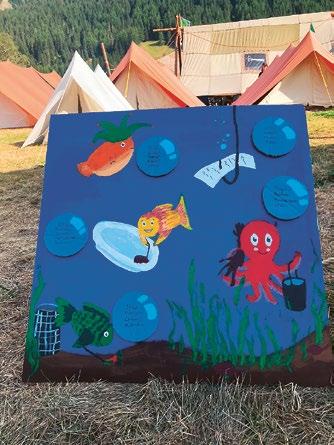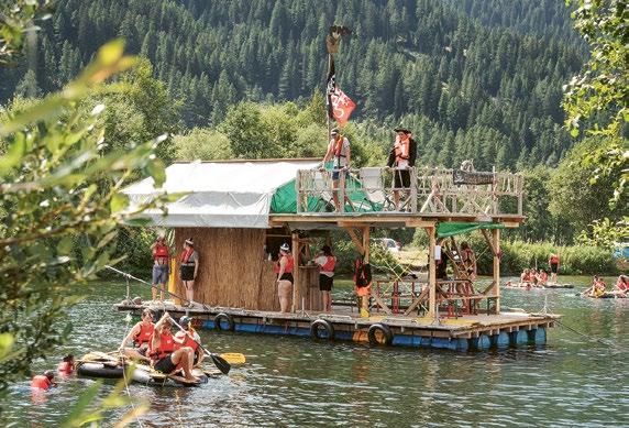 Au sud du site de camp, l’aventure n’était pas dans les arbres, mais sur les eaux du Geschinensee. Une quaran taine de personnes y ont en effet bâti un village de ra deaux. Dix d’entre elles ont aidé les responsables des activités aquatiques et sportives à construire la struc ture sur la terre ferme, tandis que les autres se sont oc cupées de la construction des radeaux, le grand comme les petits. Cette trentaine de personnes provenaient du camp de radeaux lac des Quatre-Cantons et proposent des sorties sur un grand radeau sur le lac des Quatre-Can tons (www.flosslager.ch). Au mova, les scout·e·s ont pu construire de petits radeaux avec leur aide et partir à la découverte du Geschinensee. Pour ce faire, ils devaient gagner de l’argent en participant à des jeux à terre, afin de pouvoir acheter des matériaux pour leurs petits ra deaux.