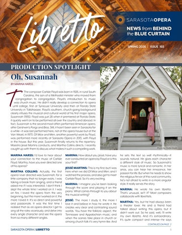 MARINA: I’ve read that Floyd’s operas, and Susannah in particular, have been compared to Italian verismo, the late 19thcentury style that portrayed real people living intense but everyday experiences, operas like Cavalleria rusticana and La bohème. Do you think it’s a valid comparison?