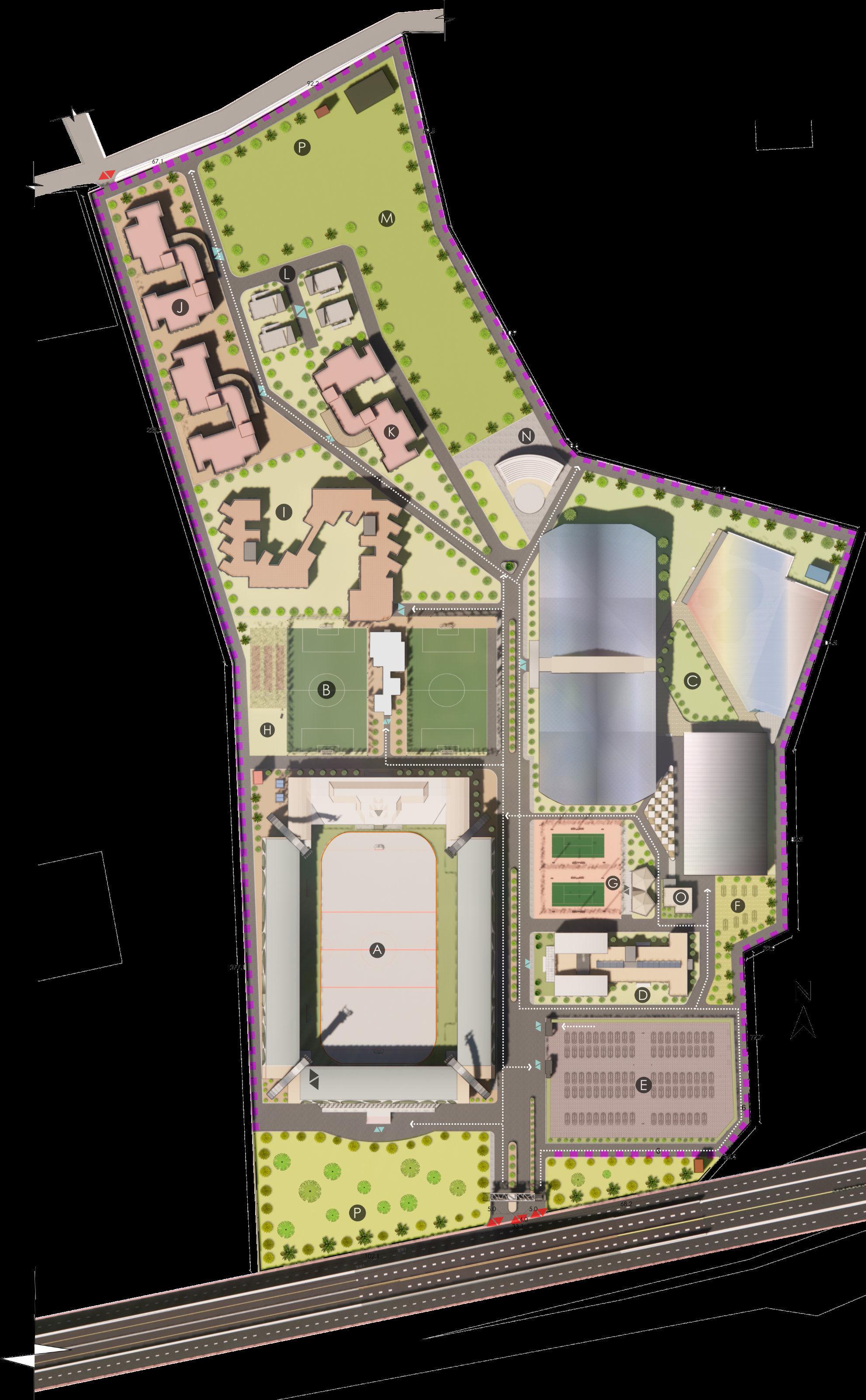 B-Footballtraining C-Indoorfield D-Adminblock E-Publicparking F-Staff&Officeparking G-Tenniscourt H-Cricketpitches I-Academicblock J-Boyshostel K-Girlshostel L-Residenceforguests M-Futureexpansion N-Oat O-Foodcourt P-OSR LEGENDS: 13 Siteplan Sitesection-AA’ Sitesection-BB’