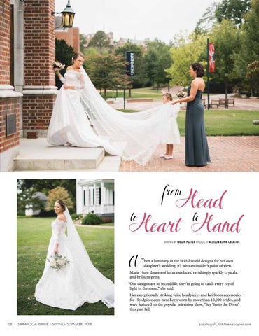 hen a luminary in the bridal world designs for her own daughter’s wedding, it’s with an insider’s point of view. Marie Hunt dreams of luxurious laces, ravishingly sparkly crystals, and brilliant gems. “Our designs are so incredible, they’re going to catch every ray of light in the room,” she said. Her exceptionally striking veils, headpieces and heirloom accessories for Headpiece.com have been worn by more than 10,000 brides, and were featured on the popular television show, “Say Yes to the Dress” this past fall. 68 | SARATOGA BRIDE | SPRING/SUMMER 2018