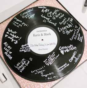 • Katie and Mark both love vinyl records, they incorporated that love into their guest book and party favors. The guest book signed by their family and friends was a vinyl record featuring their first dance song "Can't Help Falling in Love" by Elvis Presley. In addition, their party favors were mini "vinyl record" bottle openers with their wedding date and color on the front!