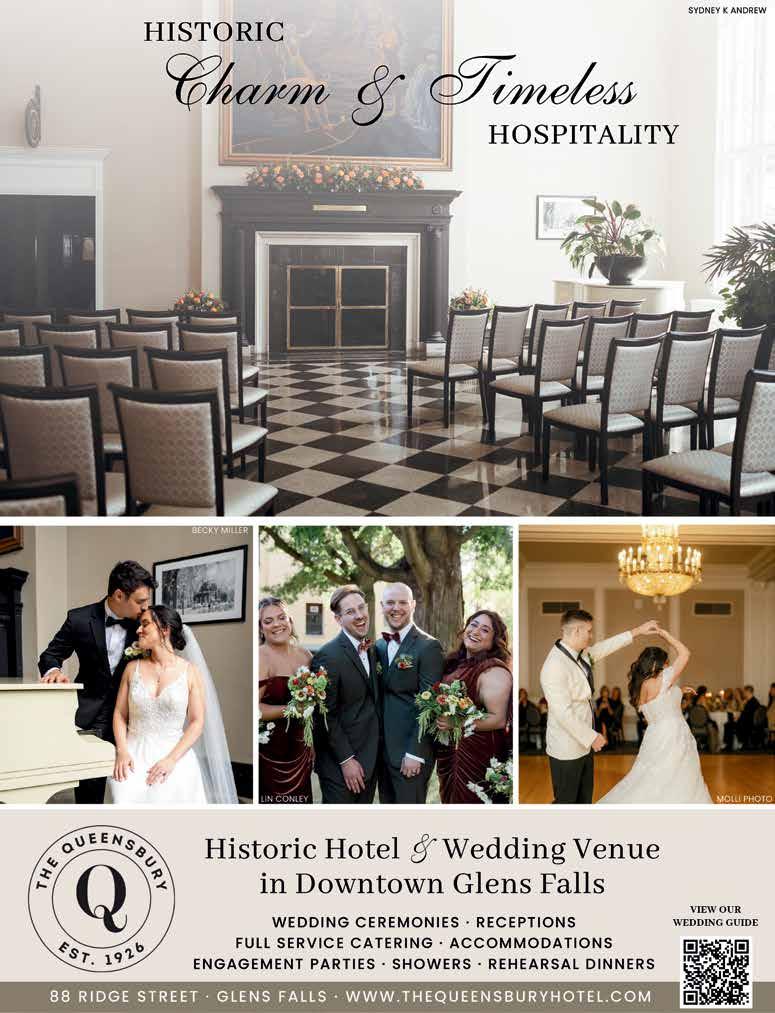 For a celebration right on the water, the Lake George Area offers a collection of exceptional lakeside venues. Bayside Resort provides customizable options with private cottages and sunset views. The Courtyard by Marriott offers a rooftop terrace and sleek event spaces in the heart of the village. The Lodges at Cresthaven, alongside the Boathouse Restaurant, offer luxury accommodations and an intimate lakeside vibe, while Melody Manor Resort and Surfside on the Lake Hotel both pair cozy charm with sweeping views and modern amenities. Couples can also celebrate aboard a classic cruise with either the Lake George Steamboat Company or the Lake George Waterfront Cruises, both offering unforgettable ceremonies and receptions while gliding across the lake. On a private island, The Sagamore Resort invites couples to host refined celebrations in a variety of elegant waterfront settings, including aboard a replica 19thcentury touring vessel.