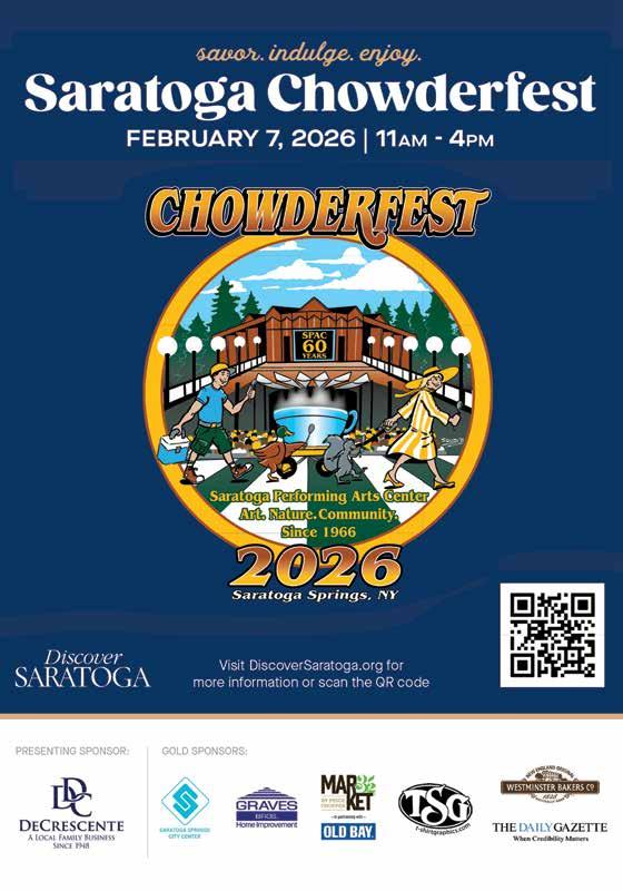 “For nearly three decades, Chowderfest has been one of those events that truly defines winter in Saratoga,” said Discover Saratoga President Darryl Leggieri. “It brings people together during the quieter season, supports our local businesses, and reminds visitors that Saratoga County is vibrant yearround. We’re excited to welcome everyone back for another unforgettable day.”