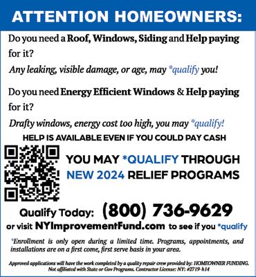 Do you need a Roof or Energy Efficient Windows & Help paying for it? YOU MAY QUALIFY THROUGH NEW RELIEF PROGRAMS (800) 944-9393 or visit NYProgramFunding.org to qualify. Approved applications will have the work completed by a repair crew provided by: HOMEOWNER FUNDING. Not affiliated with State or Gov Programs.