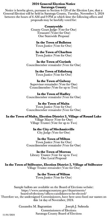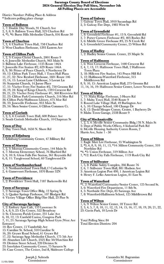 2024 General Election Day Poll Sites, according to the Saratoga County Board of Elections, are listed below Note: All Polling Places are Accessible. Sites are listed by Town, District Number: Polling Place & Address. Asterisk indicates polling place change. Polls are open 6am - 9pm.