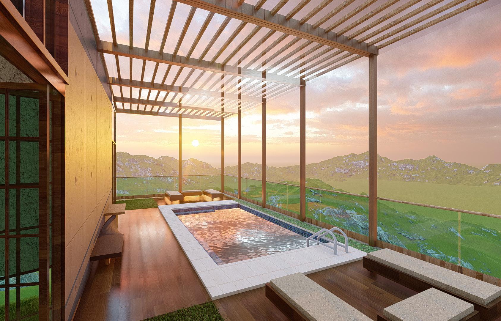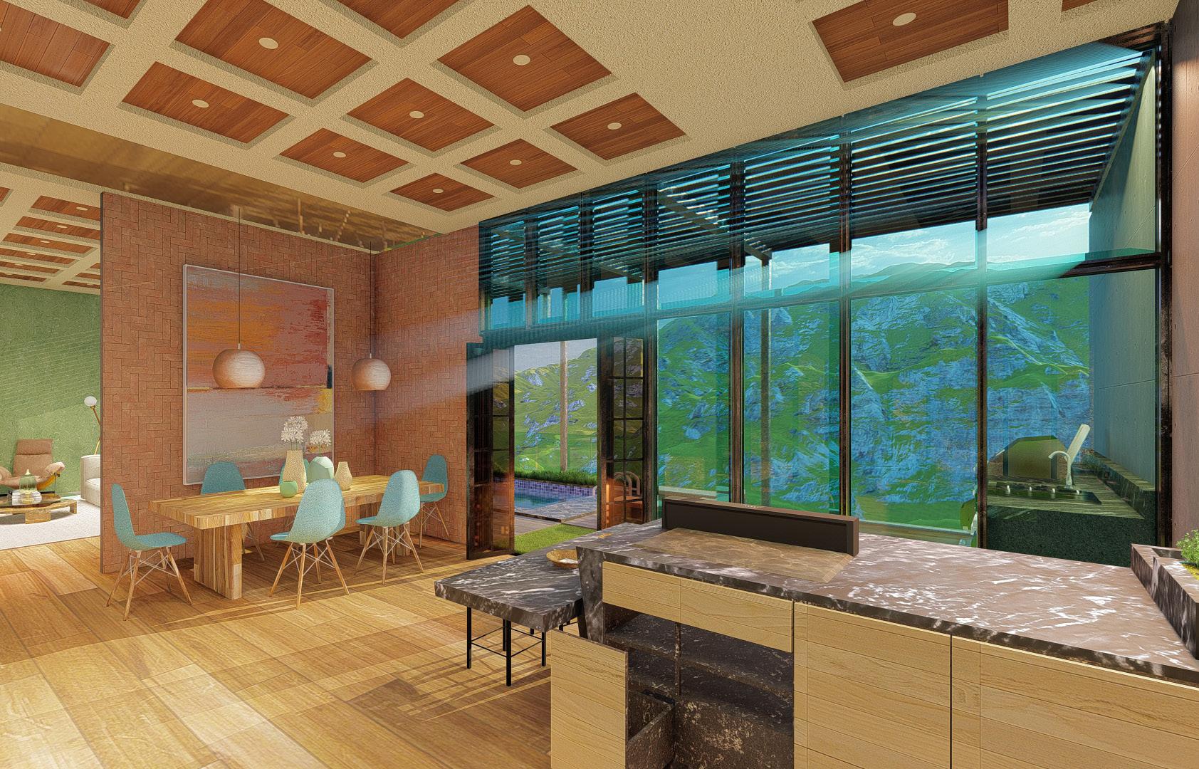 An outdoor patio with a swimming pool has been provided which opens to the great view of the hills. The region chosen offers both the height and the scenic view of the waters that have been incorporated in context to the design.