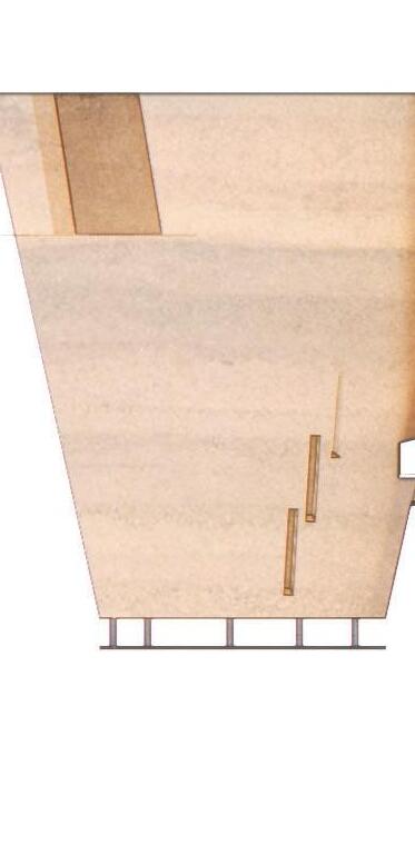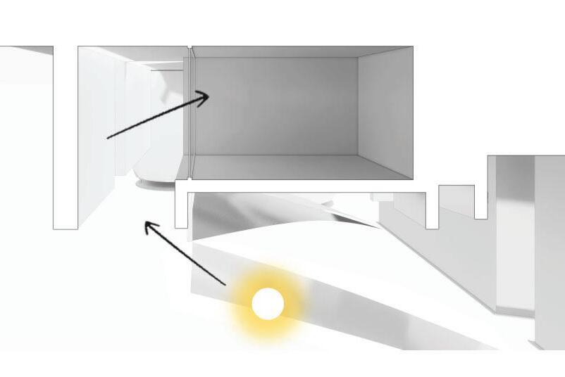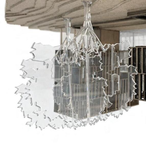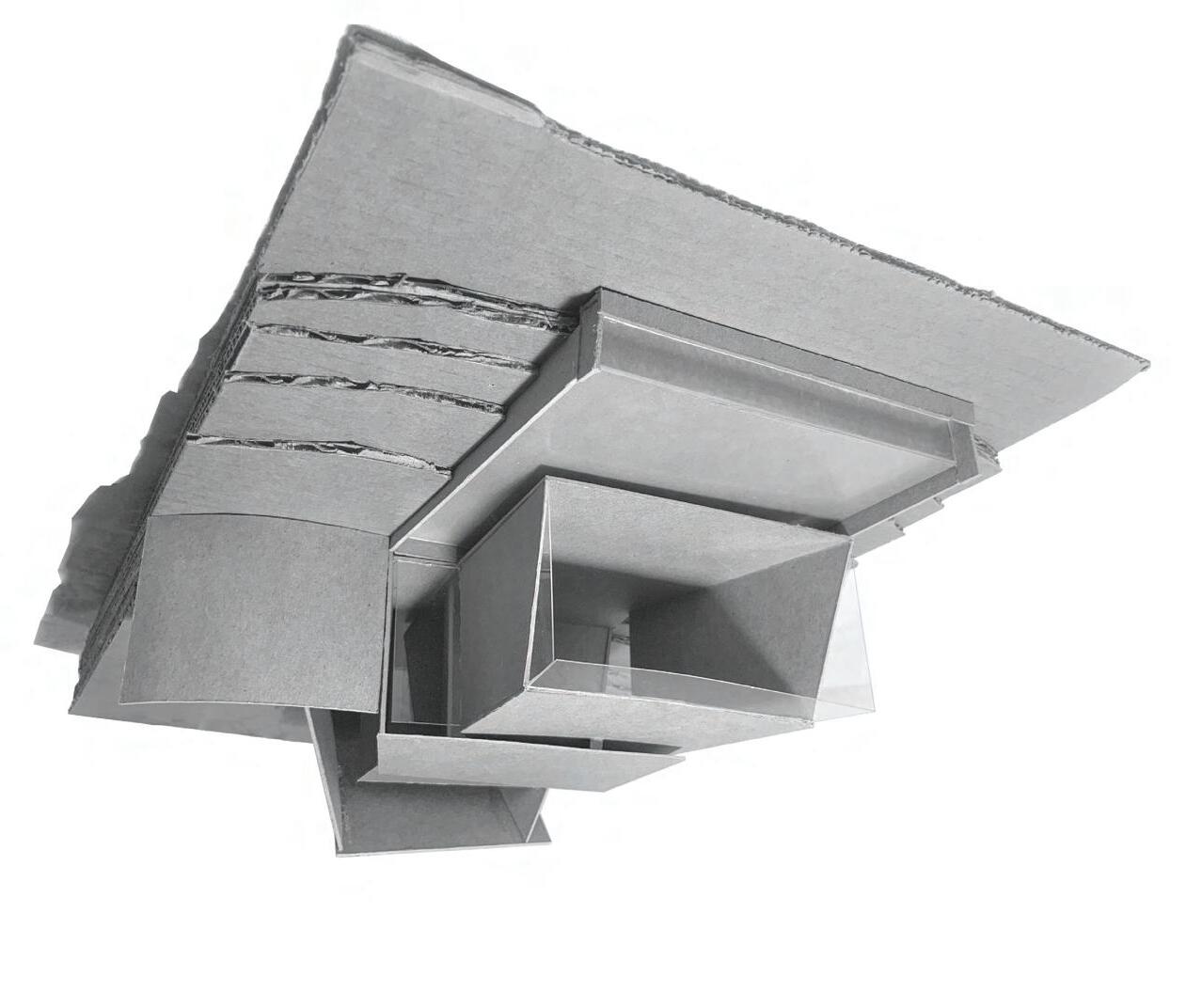 The model is crafted from laser-cut mat board and plexi-glass. To achieve the translucent concrete affect in sacred space below, the plexi-glass was coated with a thin layer of plaster to appear opaque from the exterior, but when looking through the slot in the back, one can experience the texture of light that comes through.