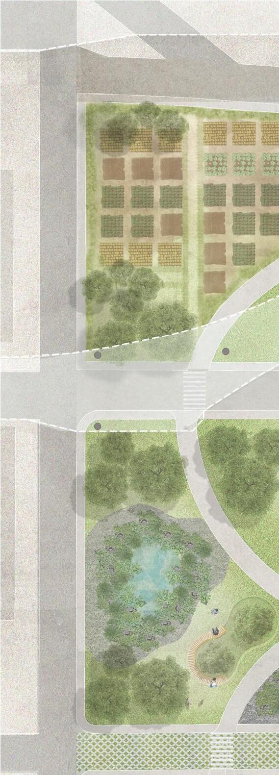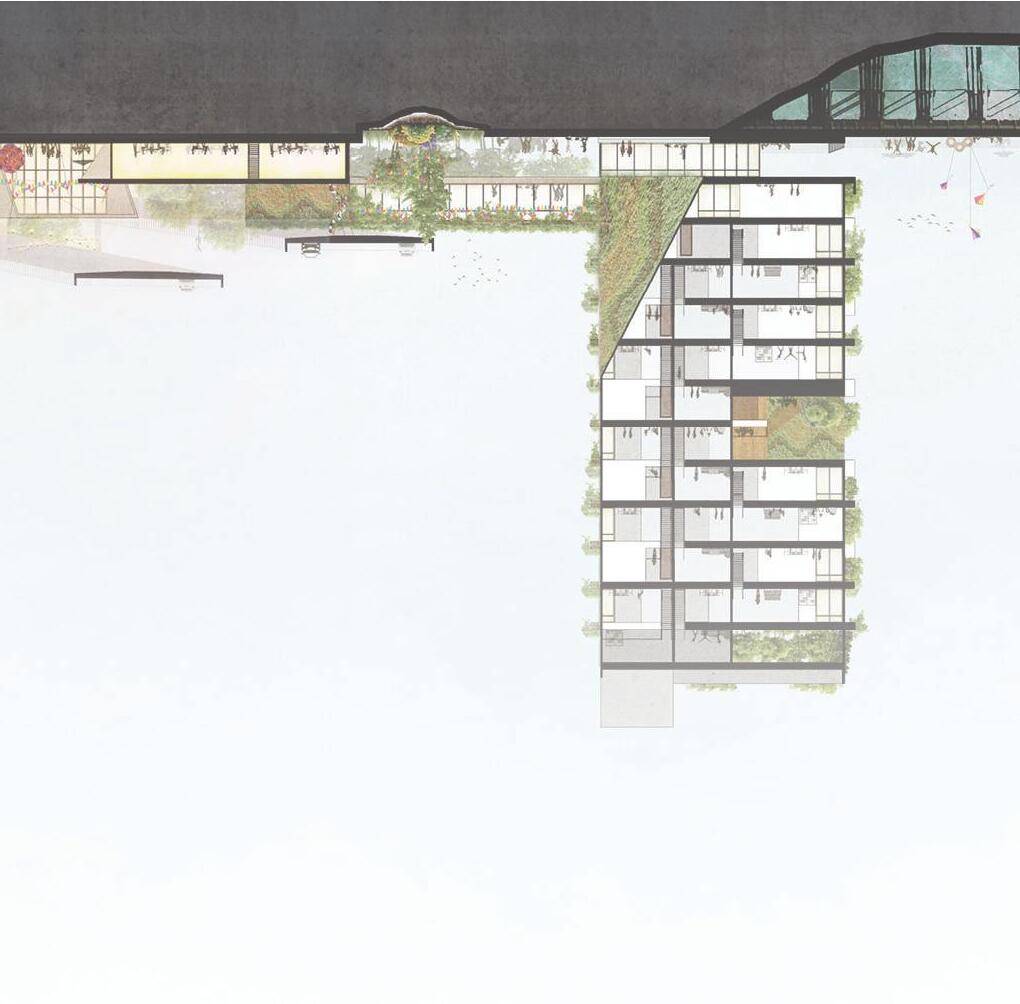 The site is located directly on the esplanade so that residents and locals can interact and use the trail for exercise or commuting. Passersby will be directed through the market area to reach the meadows, in which they can stop for lunch or grab a quick snack. The locally grown food at the market helps lessen the reliance on unhealthy processed foods. For the residents, each unit has greenery just outside their window and access to the meadows below.