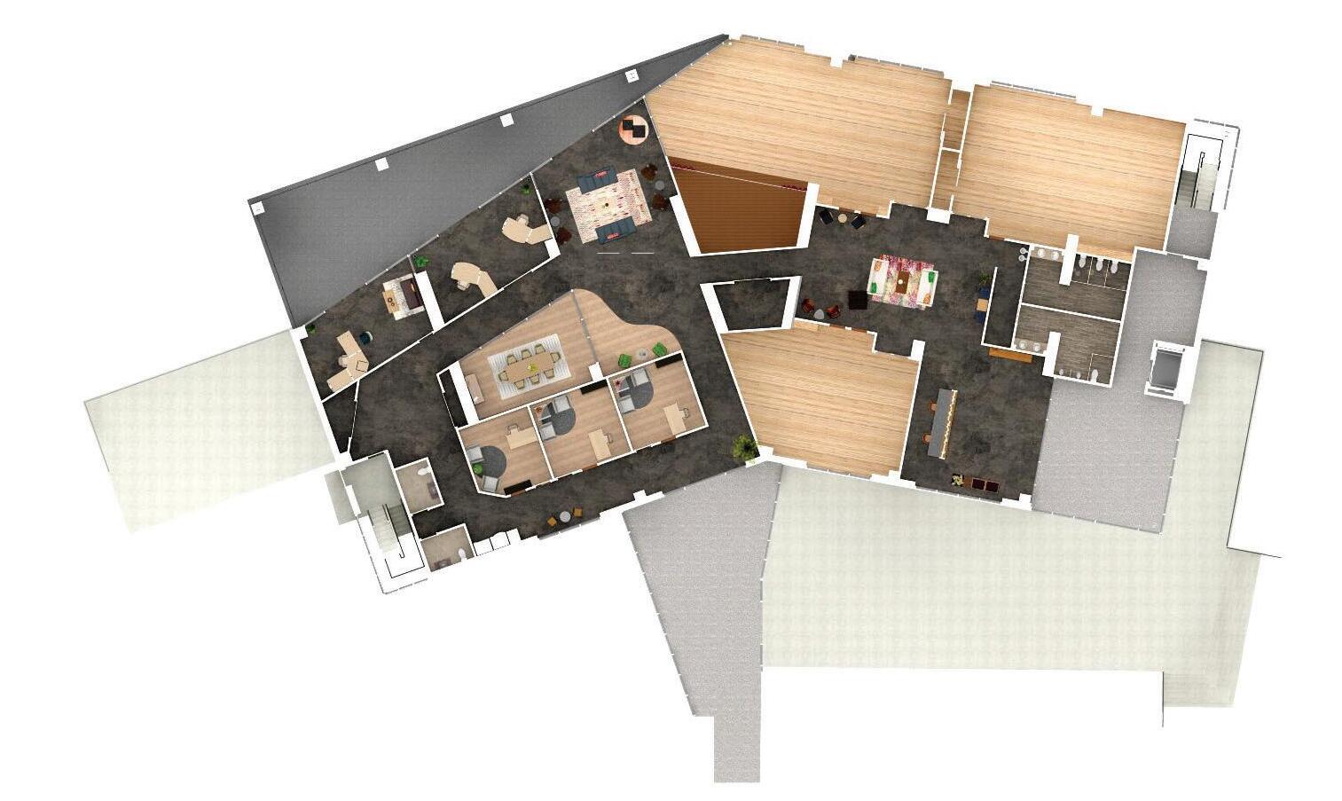 Movement Therapy is designed to help heal physically, mentally and emotionally. With multiple studios, clients can partake in a variety of classes as well as personal therapy sessions in the counseling rooms. This space also contains a stage, a group meeting space as well as an administration area and balcony.