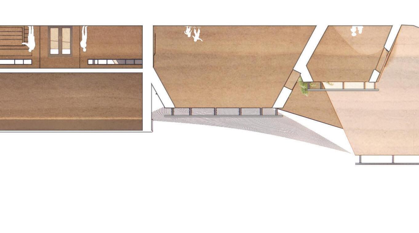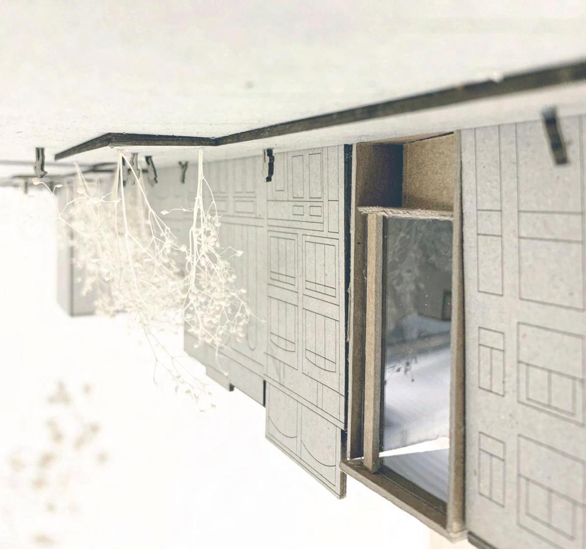 This project was unique in that it focused more on prototyping and building 1/2”=1ʼ scale model of a portion of the project. While my partners were studying remotely, the model became my focus along with the implementation of a kinetic skin of rotating tiles to give the element of wind a personality.