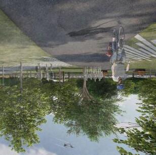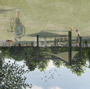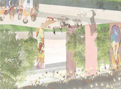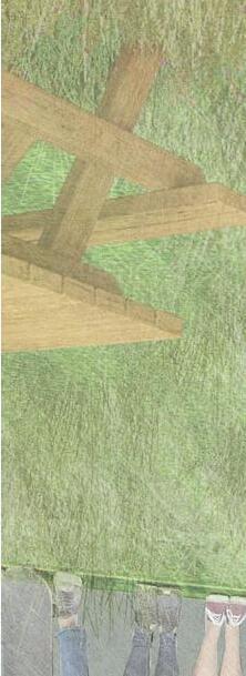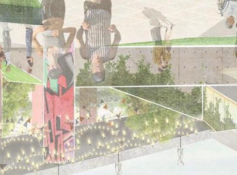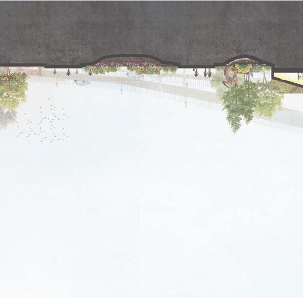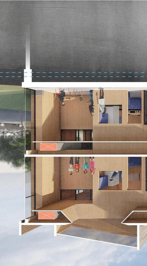 Eastbank Meadows features a market supported by local suppliers, a residential tower and a large green-space. The current 4.3 acres of asphalt will be removed and recycled to allow for the community gardens and green-space. With the goal of building up rather than out, the 14 story residential building contains 24, double height units to allow for maximum light in Portlandʼs unique climate. The market embraces Interstate-5ʼs structure and brings life into the space. While cars pass along the highway overhead, residents and the local community will be able to walk or bike to all their destinations within Portland.