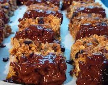 5. Melt the chocolate in a bowl over simmering water. When the flapjacks are baked, cut them into small rectangles and dip them as far as you dare into the melted chocolate.