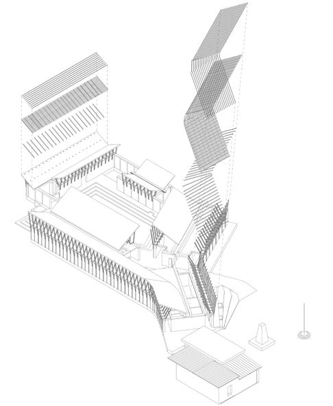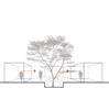 By inverting the roof profile with a center valley in the middle and rising edges, the interior spaces are visually connected with the foliage outside. The separation of the roof from the walls, while providing much needed cross ventilation, also scales the building towards the courtyard.