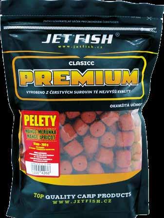 Pelety Premium jsou sestavené tak, aby se daly použít jako nástraha, ale i jako krmení, a to buď v kombinaci s boiliem, partiklem nebo jinými peletami. Jejich vysoká atraktivita je pro ryby maximálně přitažlivá a jsou doplněny o stejné esence jako boilie z řady Premium. Jejich postupný rozpad je závislý na teplotě vody a aktivitě ryb. V létě, když jsou ryby maximálně aktivní a žravé, to může být i 25 min. Ale ve studené vodě mohu vydržet i několik hodin. Dají se používat i při rybářských závodech anebo při rybaření, když chcete dosáhnout co největšího počtu záběrů.