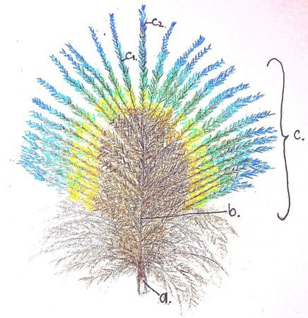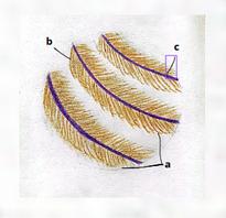 Figura 1. Ilustración del plumón con sus partes. Nota: a. Cálamo, b. Raquiz, c. Vexilo: c1. Barbas y C2. Barbulas.