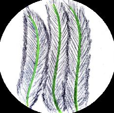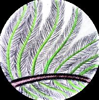 Pluma de tamaño mediano, color verde, con vexilo compuesto por barbas organizadas. En la base, hay presencia de plumón, que está formado por barbas sedosas.