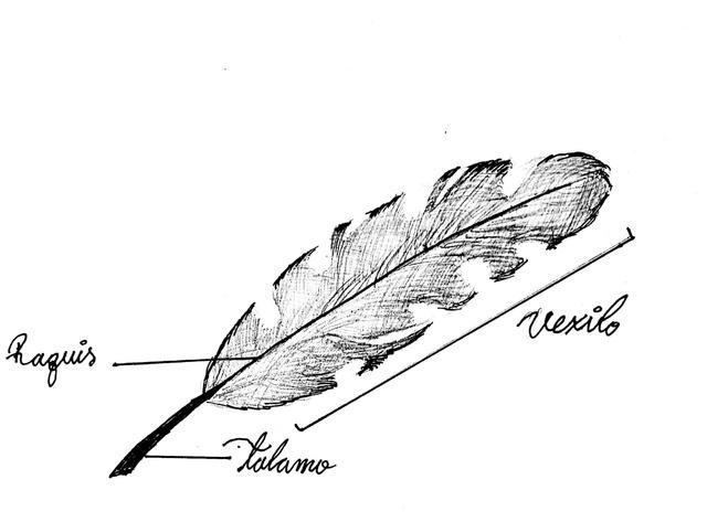 Las plumas están compuestas por un cálamo, un raquis y un vexilo que consta de: barbas, bárbulas y barbicelos.
