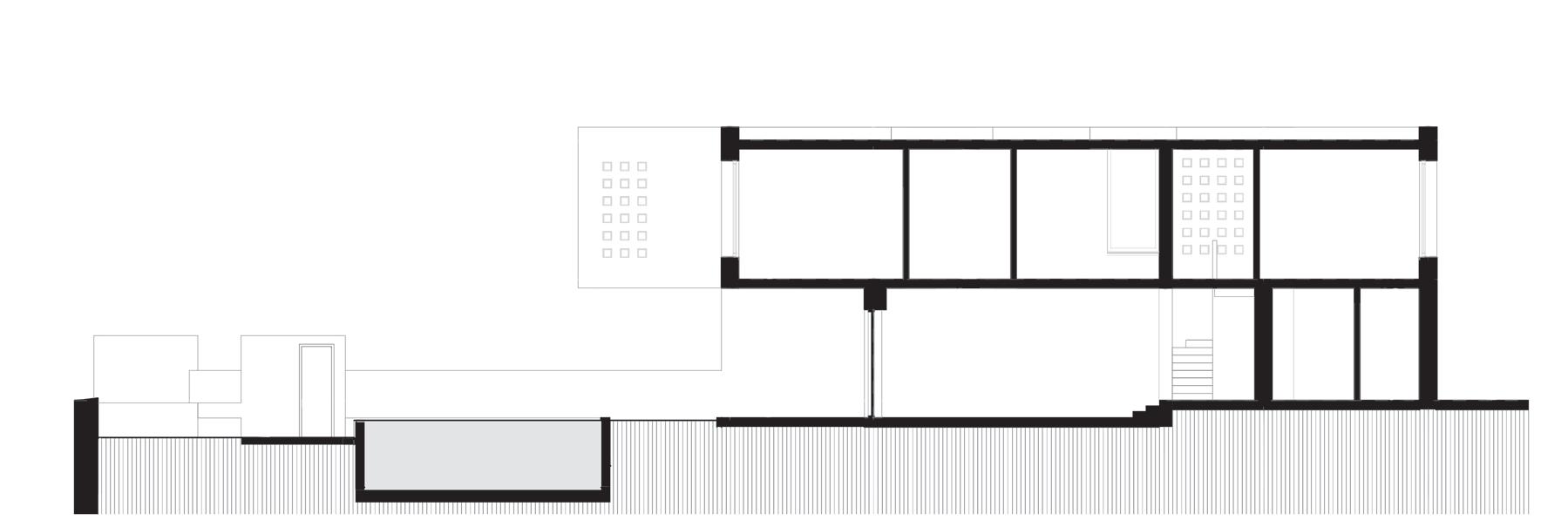 The hotel is two-lane, placed on a pedestal that protrudes from the field (conditioned by the slope of the street).