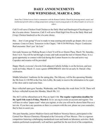 TheACTwillbeofferedhereatSt.PiusonApril11th.Theregularregistrationdeadlinefor theApril11thexamisFriday,March6.Goto:act.orgtocreateanaccountandregister You willhavetoselect"paperexam"whenyouregister,orelseyouwillnotbeshownSaintPiusasa testsite.Ifyouhaveanyquestionsorthereisaconcernwiththecost,pleaseseeyourcounselor; they'reheretoassistyou.