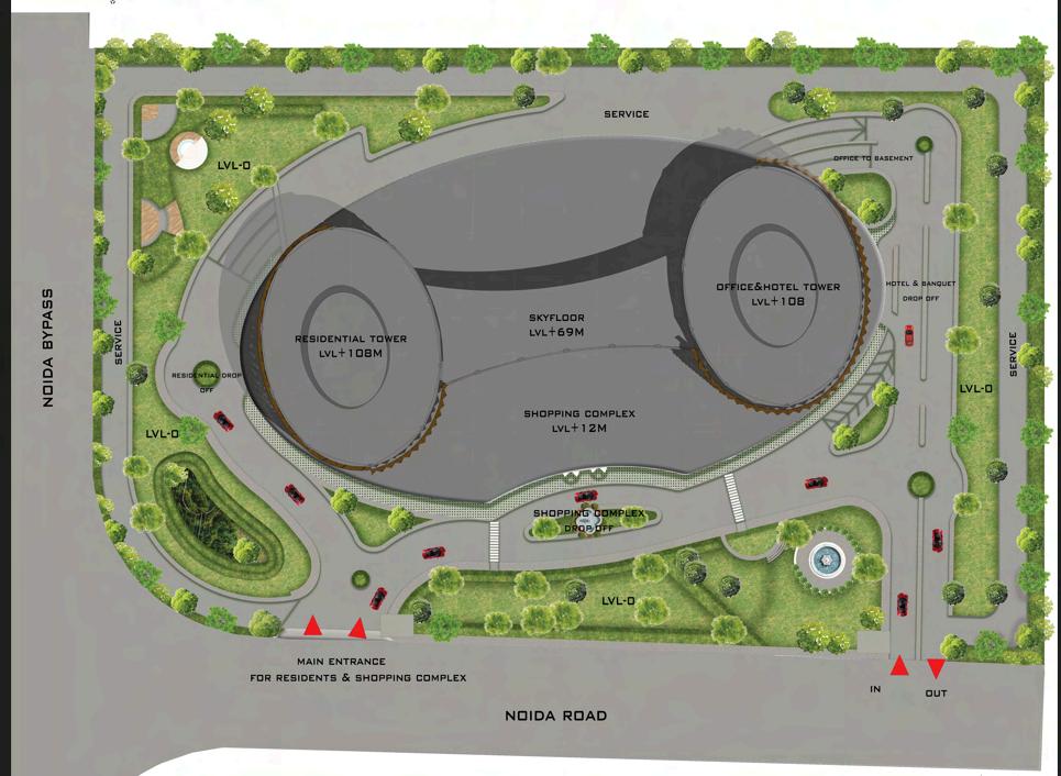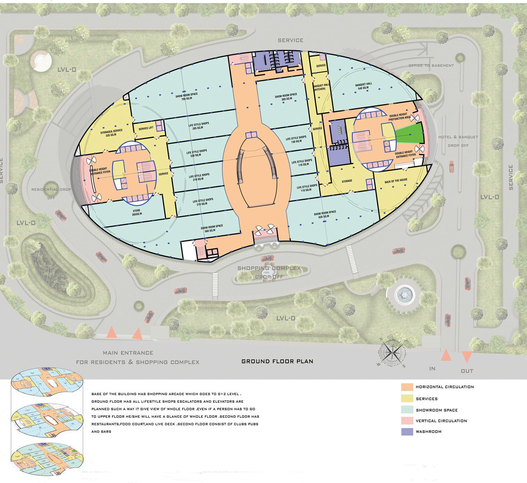 FIRST DIFFERENT ZONES ARE DIVIDED ACCORDING TO THEIR USES AS PUBLIC, PRIVATE, AND SEMIPRIVATE. IN THIS RESIDENTIAL IS CONSIDERED PRIVATE, HENCE SEGREGATED FROM COMMERCIAL. COMMERCIAL IS DIVIDED INTO THREE FURTHER ARTS- SHOPPING, HOTEL & OFFICE AS SHOPPING IS PUBLIC AND OFFICE AND HOTEL ARE CONSIDERED SEMI-PUBLIC. SHOPPING HIB IS PLACED IN THE CENTER OF THE SITE AS IT HAS MAXIMUM FOOTFALLNAND RESIDENTS ARE PROVIDED WITH A PRIVATE ZONE ON THE LEFT AND THE HOTEL AND OFFICE ARE ZONED TOGETHER VERTICALLY. A SINGLE MAIN ROAD RUNS THE TRAFFIC IN AND OUT OF THE SITE, WHERE ZONES ARE GIVEN ACCESS VIA ARTIRIALS ROADS SITE IS GIVEN WITH 2 ENTRY AND EXIT POINTS.