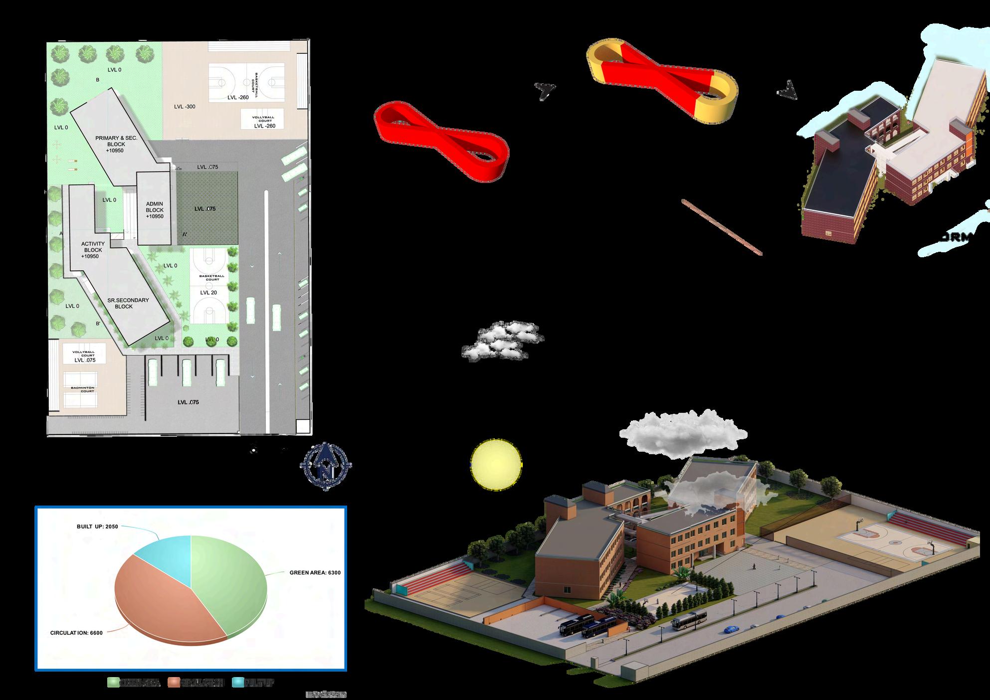 THE CONCEPT IS TAKEN FROM INFINITY AS AN EDUCATION AND VALUES GIVEN BY SCHOOL CANNOT BE FINITE ALSO IT IS A CONTINUOUS CYCLE OF EDUCATION AND ALL CLASSES ARE INTERCONNECTED JUST LIKE INFINITY. TWO WINGS CONNECTED WITH EACH OTHER VIA COURTYARD AND ALSO THE SPACESNEEDEDBYWHOLESCHOOLISPLACEDONINTERCONNECTION.
