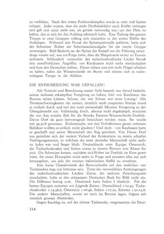 zu verfehlen. Nach den ersteii Positionskämpfen wurde es vorn und hinten ruhiger. Jeder wusste, dass die steile Dorftäliabfalirt aucli Kräfte verlangte und gab sich nicht rnehr aus, als gerade notwendig war,'um den Platz zu halten, den er sich für den Aufstieg erkämpft liatte. Eine Teilung des ganzen Trupps in zwei Gruppen vollzog sicli immerhiri in der ersteii Hälfte des Aufstieges. Wäl-irend also Novak die Spitzenpatrouille anführte, hatte sicli der Schweizer Weber der Schrittmacheraufgabe für die zweite Gruppe uriterzogen. Bald flackerte an der Spitze der Kampf um die Führung neuerdings wieder auf, was zur Folge hatte, dass die Hauptmacht weiter an Terrain einbüsste. Schliesslicli vermochte der tscheclioslovakisclie Läufer Novak den unaufl~örlicheii Angriffen von Kaufmanils nicht mehr staildzulialten und liess den Deutschen ziehen. Dieser schien i i u i ~erst recht Flügel erhalten zu haben, nahm die Wasserscheide im Sturm und stürzte sicli iii walinwitzigem Tempo iii die Abfahrt. D I E ENTSCHEIDUNG W A R GEFALLEN ! Alle Vorsicht und Berechnung ausser Acht lassend, nur darauf bedacht, seinen mülisam erkämpften Vorsprung zu halten, fuhr von Kaufmann das Renneil seines Lebens. Scliuss, iiix wie Schuss war seine Losung ! Alle Terrainschwierigkeiten der untern, ziemlich stark coupierten Strecke stund er einfacli durch und traf mit rund zweieinlialb Minuten Vorsprung an der Ubergabestelle ein. Vollständig frisch, absolut niclit abgekämpft, trotzdem die von ihm erzielte Zeit für die Strecke Parseiiri-Wasserscheide-DorftäliDavos Dorf als ganz hervorragend bezeichnet werden muss. Sie wurde mit 39:30,8 gemessen. Einheimische, mit den Verhältnissen genau vertraute Skifahrer wollten es eiilfach nicht glauben ! Und doch - von Kaufmann liatte es geschafft und seiner Mannscliaft den Sieg gesichert. Von Davos Dorf aus gestaltete sich der weitere Verlauf der Konkurrenz zu einem scliarfen Verfolgungsrennen, in welchem die erste deutsclie Mannschaft nicht mehr zu holen war uiid Sieger blieb. Deutschlands erste Equipe, Osterreich, die Tscheclioslovakei und Italien waren in diesem Rennen eine Klasse fiir sich. Die Schweizer kamen, nachdem sichWeber im Dorftäli im Kurs geirrt hatte, für einen Ehrenplatz nicht mehr in Frage und mussten alles aus sich heiausgeben, um sich der zweiten italienischen Staffel zu erwehren. Eine kurze Cliarakteristik des Rennverlaufes auf den restliclien vier Teilstrecken mag von Interesse sein. Trotz der verzweifelten Anstrengungen des tschechoslovakischen Läufers Zizius, der mehrere Zwisclieiispurts einschaltete, holte er den stämmige11 Deutschen Buck bis Bildi nicht ein. Die Differenz betrug 2:06. Osterreich hatte Italien I überholt. Für die besten Equipen notierten wir folgende Zeiten : Deutschland 1:12:42, Tschechoslovakei I : 14:48,6, Osterreich I : 16:46, Italien 1:17:22, Schweiz 1:20:12,8. Die andern Manschaften, soweit sie noch im Rennen lagen, folgten mit ziemlich grossen Abständen. Gegen Inschlag zu, auf der dritten Teilstrecke, vergrösserten die Deut-