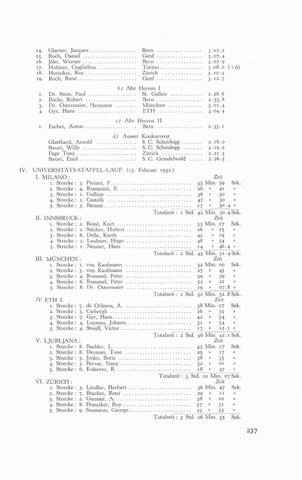 IV. UNIVERSITATS-STAFFEL-LAUF. (13. Februar 1932.) I. M I L A N 0 : Zeit I . Strecke : 3. Pariani, F . . . . . . . . . . . . . . . . . . . . . . . . . . . . . . 33 Min. 59 Sek. 2. Strecke : 4. Romanini, E. . . . . . . . . . . . . . . . . . . . . . . . . . . 26 II 41 3. Strecke : I . Gallina . . . . . . . . . . . . . . . . . . . . . . . . . . . . . . . 36 » 50 )I 4. Strecke : I . Castelli . . . . . . . . . . . . . . . . . . . . . . . . . . . . . . . 47 30 30.4 5. Strecke : 5. Barassi . . . . . . . . . . . . . . . . . . . . . . . . . . . . . . . . 17 n Totalzeit : 2 Std. 42 Min. 30.4 Sek. 11. INNSBRUCK : Zeit I . Strecke : 2. Reinl, Kurt . . . . . . . . . . . . . . . . . . . . . . . . . . . 33 Min. 07 Sek. 2. Strecke : 2. Salcher, Hubert . . . . . . . . . . . . . . . . . . . . . . . . 26 D 25 )) 19 3. Strecke : 6. Delle, Karth . . . . . . . . . . . . . . . . . . . . . . . . . . 42 11 4. Strecke : 2. Leubner, Hugo . . . . . . . . . . . . . . . . . . . . . . . . 48 54 11 j. Strecke : I . Neuner, H a n s . . . . . . . . . . . . . . . . . . . . . . . . . . 14 46.4 -Totalzeit : 2 Std. 45 Min. 3 I . 4 Sek. 111. MÜNCHEN : Zeit Sek. I . Strecke : I . von Kaufmann . . . . . . . . . . . . . . . . . . . . . . . . 32 Min. oo 1) 2. Strecke : 5. von Kaufmann . . . . . . . . . . . . . . . . . . . . . . . . 27 )) 45 3. Strecke : 4. Rommel, Peter . . . . . . . . . . . . . . . . . . . . . . . . 39 39 21 4. Strecke : 6. Rommel, Peter . . . . . . . . . . . . . . . . . . . . . . . . 52 5. Strecke : 8. Dr. Ostermaier . . . . . . . . . . . . . . . . . .-. .-. . . . 19 D 07.8 )) Totalzeit : 2 Std. 50 Min. 52.8 Sek. Zeit IV E T H I. 38 Min. 07 Sek. I . Strecke : 7. de Orleans, A. . . . . . . . . . . 2. Strecke: 3. Cebergh . . . . . . . . . . . . . . . . . . . . . . . . . . . . . . 26 M 35 )) 3. Strecke : 7. Gyr, Hans.. . . . . . . . . . . . . . . . . . . . . . . . . . . . 42 » 54 1) . . . . . . . . . . . . . . . . . . . . . . 51 D 54 4. Strecke : 4. . Luvmes. . . "Tohann.. 5. Strecke : 4. Streiff, Victor . . . . . . . . . . . . . . . . . . . . . . . . . . 17 12.1 Totalzeit : 2 Std. 56 Min. 42. I Sek. Zeit V. LJUBLJANA : I . Strecke: 8. Baebler, L . . . . . . . . . . . . . . . . . . . . . . . . . . . . . 43 Min. 27 Sek. )I 17 11 2. Strecke : 8. Decman, Tone . . . . . . . . . . . . . . . . . . . . . . . . 29 3. Strecke : 3. Jenko, Boris . . . . . . . . . . . . . . . . . . . . . . . . . . . 38 » 35 1) 4. Strecke : 5. Bervar, Nany . . . . . . . . . . . . . . . . . . . . . . . . . . 52 )I 01 5. Strecke : 6. Kukovec, R. . . . . . . . . . . . . . . . . . . . . . . . . . . . 18 2 47 -. . ~ o t a l z e i t: 3 Std. 02 Min. 07 Sek. GI. ZURICH : Zeit I . Strecke : G. Lindlar. Herbert . . . . . . . . . . . . . . . . . . . . . . . 36 Min. 47 Sek. 11 2. Strecke : 7. Bracher, Rene . . . . . . . . . . . . . . . . . . . . . . . . . 29 3. Strecke : 2. Gansser, A. . . . . . . . . . . . . . . . . . . . . . . . . . . . 38 )) 01 4. Strecke : 8. Hunziker, Roy . . . . . . . . . . . . . . . . . . . . . . . . . 57 D 31 11 5. Strecke : 9. Susmann, George.. . . . . . . . . . . . . . . . . . . . . . 25 1) 25 D Totalzeit : 3 Std. 06 Min. 55 Sek. ))