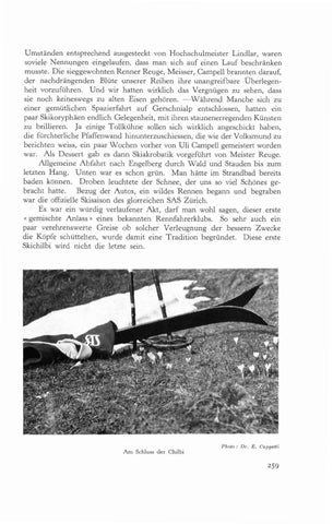 Umständen entsprechend ausgesteckt von Hochschulmeister Lindlar, waren soviele Nennungen eingelaufen, dass man sich auf einen Lauf beschränken musste. Die sieggewohnten Renner Reuge, Meisser, Campell brannten darauf, der nachdrängenden Blüte unserer Reihen ihre unangreifbare oberlegenheit vorzuführen. Und wir hatten wirklich das Vergnügen zu sehen, dass sie noch keineswegs zu alten Eisen gehören. -Während Manche sich zu einer gemütlichen Spazierfahrt auf Gerschnialp entschlossen, hatten ein paar Skikoryphäen endlich Gelegenheit, mit ihren staunenerregenden Künsten zu brillieren. Ja einige Tollkühne sollen sich wirklich angeschickt haben, die fürchterliche Pfaffenwand hinunterzuschiessen, die wie der Volksmund zu berichten weiss, ein paar Wochen vorher von Uli Campell gemeistert worden war. Als Dessert gab es dann Skiakrobatik vorgeführt von Meister Reuge. Allgemeine Abfahrt nach Engelberg durch Wald und Stauden bis zum letzten Hang. Unten war es schon grün. Man hätte im Strandbad bereits baden können. Droben leuchtete der Schnee, der uns so viel Schönes gebracht hatte. Bezug der Autos, ein wildes Rennen begann und begraben war die offizielle Skisaison des glorreichen SAS Zürich. Es war ein würdig verlaufener Akt, darf man wohl sagen, dieser erste gemischte Anlass)) eines bekannten Rennfahrerklubs. So sehr auch ein paar verehrenswerte Greise ob solcher Verleugnung der bessern Zwecke die Köpfe schüttelten, wurde damit eine Tradition begründet. Diese erste Skichilbi wird nicht die letzte sein. ((
