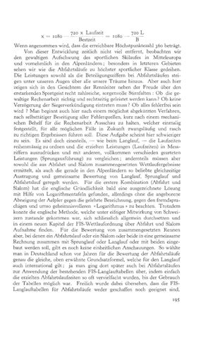 720 X Laufzeit 720 L 1080 - -- -- = 1080 - Bestzeit B Wenn angenommen wird, dass die erreichbare Höchstpunktezahl 360 beträgt. Von dieser Entwicklung zeitlicl-i nicht viel entfernt, beobachten wir den gewaltigen Aufschwung des sportlichen Skilaufes in Mitteleuropa und vornehmlich in den Alpenländern ; besonders in letzteren Gebieten sehen wir wie die Abfalirtsläufe zu höchster sportlicher Klasse gedeihen. Die Leistungen sowol-il als die Beteiligungsziffern bei Abfahrtsläufen steigen unter unseren Augen über alle unsere Träume hinaus. Aber auch liier zeigen sich in den Gesichtern der Rennleiter neben der Freude über den erstarkenden Sportgeist recht zal-ilreicl-ie, sorgenvolle Stirnfalten : O b die gewaltige Recl-ienarbeit richtig und rechtzeitig geleistet werden kann ? O b keine Verzögerung der Siegerverkündigung eintreten muss ? O b alles fehlerfrei sein wird ? Man beginnt aucli hier nach einem möglichst abgekürzten Verfahren, nach selbsttätiger Beseitigung aller Fehlerquellen, kurz nach einem mecl-ianischen Behelf für die Rechenarbeit Ausschau zu halten, welcher einmalig festgestellt, für alle möglichen Fälle in Zukunft zwangsläufig und rasch zu richtigen Ergebnisse11 führen soll. Diese Aufgabe scheint hier schwieriger zu sein. Es sind docli einesteils, - wie beim Langlauf, - die Laufzeiten reihenmässig zu ordnen und die erzielten Leistungen (Laufzeiten) in Messziffern auszudrüclzen und mit anderen, vollkommen verschieden gearteten Leistungen (Sprungausführung) zu vergleichen; andernteils müssen aber sowohl die aus Abfahrt und Slalom zusammengesetzteii Wettlaufergebiiisse ermittelt, als auch die gerade in den Alpei-iländern so beliebte gleichzeitige Austragung und gemeinsame Bewertung von Langlauf, Sprunglauf und Abfahrtslauf geregelt werden. Für die erstere Kombination (Abfahrt und Slalom) hat die englische Gründliclikeit bald eine ausgezeiclinete Lösung mit Hilfe von Logarithmentafeln gefui-iden, allerdings ohne die angeborene Abneigung der Aelpler gegen die gelehrte Bezeiclinung, gegen den fremdsprachigen und umso gelieimnisvolleren Logarithmus » zu beachten. Trotzdem konnte die englisclie Methode, welche unter eifriger Mitwirkung von Schweizern zustande gekommen war, sicl-i scl-iliesslicl-i allgemein durchsetzen und in einem neuen Kapitel der FIS-Wettlaufordnung über Abfahrt und Slalom Aufnahme finden. Für die Bewertung von zusammengesetzten Rennen aber, bei denen ein Abfahrtslauf oder ein Slalom oder beide in eine gemeinsame Rechnung zusammen mit Sprunglauf oder Langlauf oder mit beiden eingebaut werden soll, gibt es noch keine einheitlichen Anschauungen. So wählte man in Deutschland schon vor Jahren für die Bewertung der Abfahrtsläufe genau die gleiclie, oben erwähnte Grui-idsatzformel, welche für den Langlauf auch international gilt; ja man ging dort später auch bei Abfahrtsläufen zur Anwendung der bestehenden FIS-Langlauftabellen über, indem einfach die erzielten Abfahrtslaufzeiten so oft vervielfacht wurden, bis der Gebrauch der Tabellen möglich war. Freilich wurde dabei übersehen, dass die FISLanglauftabellei-i für Abfahrtsläufe weder geschaffen nocl-i geeignet sind, X =