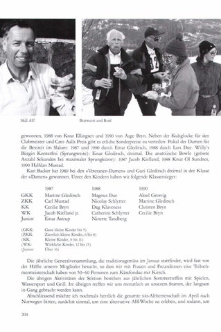 gewonnen, 1988 von Knut Ellingsen und 1990 von Aage Bryn. Neben der Kuhglocke für den Clubmeister und Cato Aalls Preis gibt es etliche Sonderpreise zu verteilen: Pokal der Damen für die Bestzeit im Slalom: 1987 und 1990 durch Einar Gleditsch, 1988 durch Lars Due. Willy's Bürgin Konterfrei (Sprungweite) : Einar Gleditsch, dreimal. Die anatülische Bowle (grösste Anzahl Sekunden bei maximaler Sprungkürze) : 1987 Jacob Kielland, 1988 Knut 01 Sundnes, 1990 Halfdan Mustad. Kari Backer hat 1989 bei den «Veteranen-Damen» und Guri Gleditsch dreimal in der Klasse der «Damen» gewonnen. Unter den Kindern haben wir folgende Klassensieger: 1987