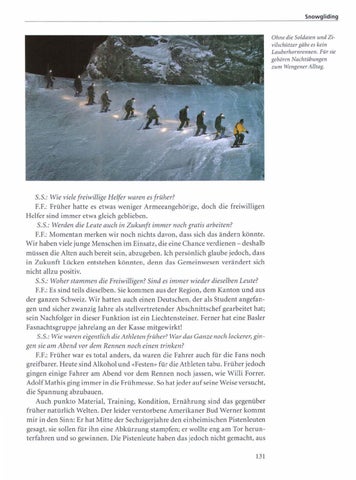 5.5.: Wie viele freiwillige Helfer waren es früher? F.F.: Früher hatte es etwas weniger Armeeangehörige, doch die freiwilligen Helfer sind immer etwa gleich geblieben. 5.5.: Werden die Leute auch in Zukunft immer noch gratis arbeiten? F.F.: Momentan merken wir noch nichts davon, dass sich das ändern könnte. Wir haben viele junge Menschen im Einsatz, die eine Chance verdienen - deshalb müssen die Alten auch bereit sein, abzugeben. Ich persönlich glaube jedoch, dass in Zukunft Lücken entstehen könnten, denn das Gemeinwesen verändert sich nicht allzu positiv. 5.5.: Woher stammen die Freiwilligen? Sind es immer wieder dieselben Leute? F.F.: Es sind teils dieselben. Sie kommen aus der Region, dem Kanton und aus der ganzen Schweiz. Wir hatten auch einen Deutschen, der als Student angefangen und sicher zwanzig Jahre als stellvertretender Abschnittschef gearbeitet hat; sein Nachfolger in dieser Funktion ist ein Liechtensteiner. Ferner hat eine Basler Fasnachtsgruppe jahrelang an der Kasse mitgewirkt! S. 5.: Wie waren eigentlich die Athleten früher? War das Ganze noch lockerer, gingen sie am Abend vor dem Rennen noch einen trinken? F.F.: Früher war es total anders, da waren die Fahrer auch für die Fans noch greifbarer. Heute sind Alkohol und «Festen» für die Athleten tabu. Früher jedoch gingen einige Fahrer am Abend vor dem Rennen noch jassen, wie Willi Forrer. AdolfMathis ging immer in die Frühmesse. So hat jeder auf seine Weise versucht, die Spannung abzubauen. Auch punkto Material, Training, Kondition, Ernährung sind das gegenüber früher natürlich Welten. Der leider verstorbene Amerikaner Bud Werner kommt mir in den Sinn: Er hat Mitte der Sechzigerjahre den einheimischen Pistenleuten gesagt, sie sollen für ihn eine Abkürzung stampfen; er wollte eng am Tor herunterfahren und so gewinnen. Die Pistenleute haben das jedoch nicht gemacht, aus