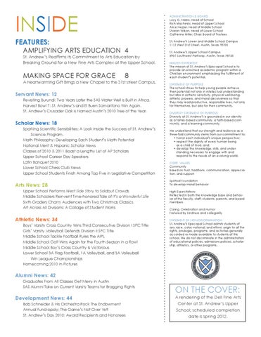 On The Cover: A rendering of the Dell Fine Arts Center at St. Andrewâs Upper School; scheduled completion date is spring 2012.