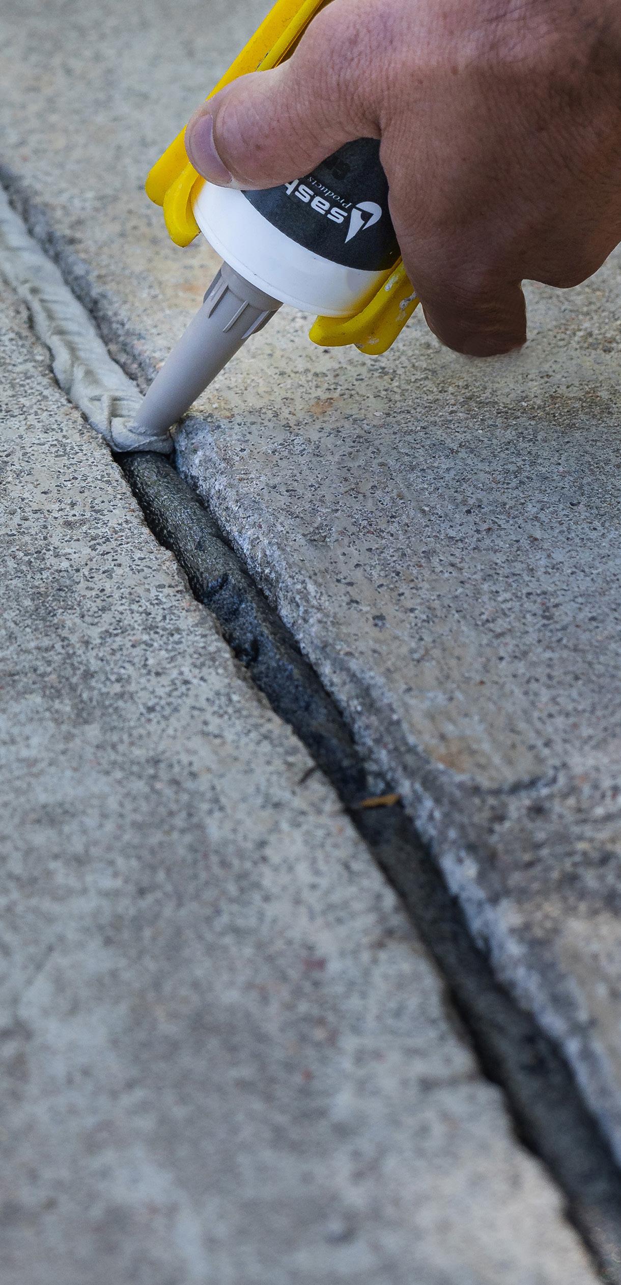 Step outside and you’re likely to see a concrete crack in less than two seconds flat. They’re in driveways, sidewalks, garages, patios, pool decks, and basements. Cracks harbor weeds and anthills, and cause toe injuries (ouch!). They’re eyesores that never seem to go away. Changes in temperature, moisture, shifting soils, and traffic only make them worse. Enough is enough! Just say “no” to cracks. Use Slab® – The Serious Fix for Concrete Cracks. Slab is an easy-toapply, water-based sealant that stretches up to 266% of original crack size! Your knees and back will thank you for using a product that won’t require repeated repairs year after year. Slab sticks, stretches, and stays to banish concrete cracks for good.