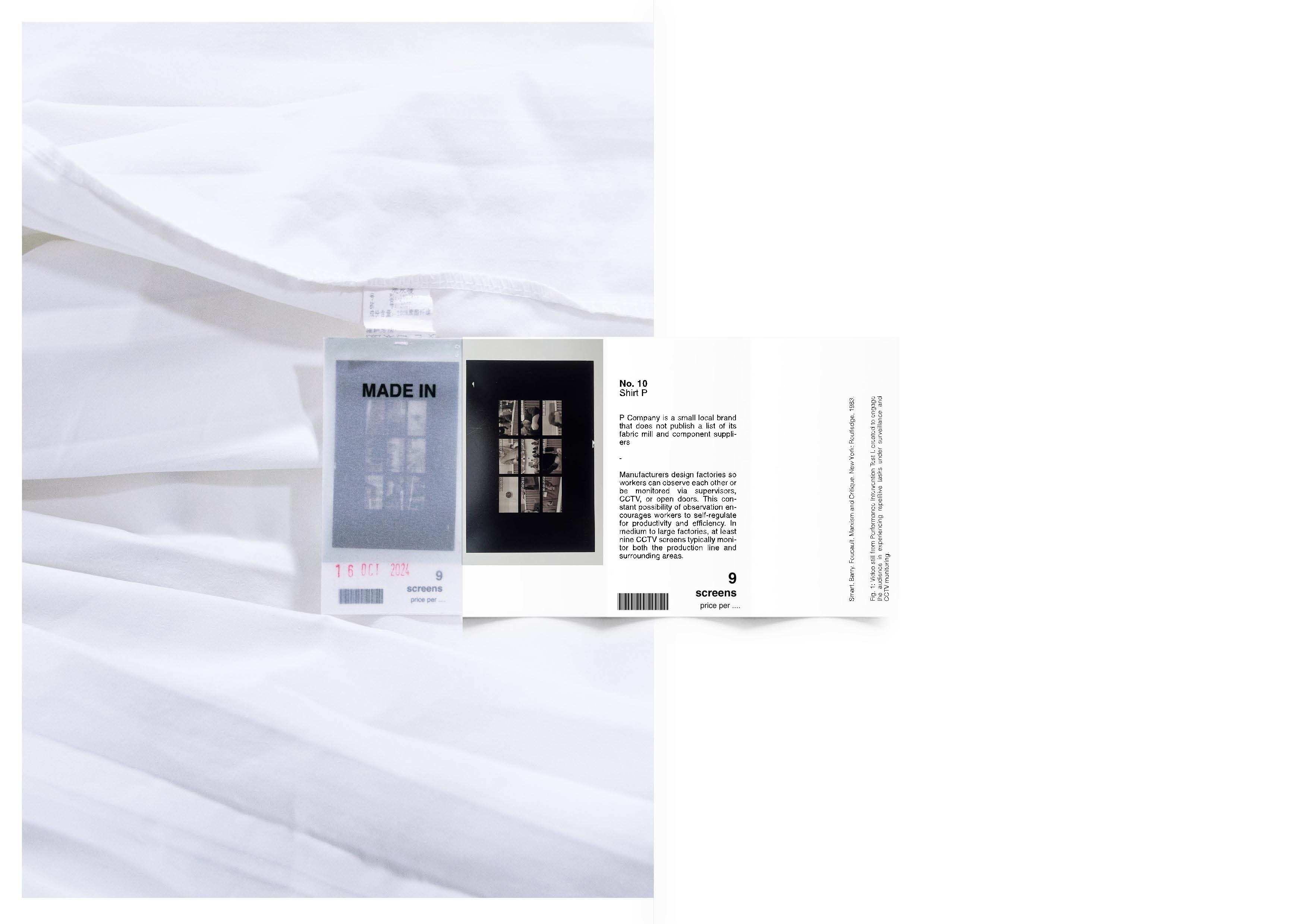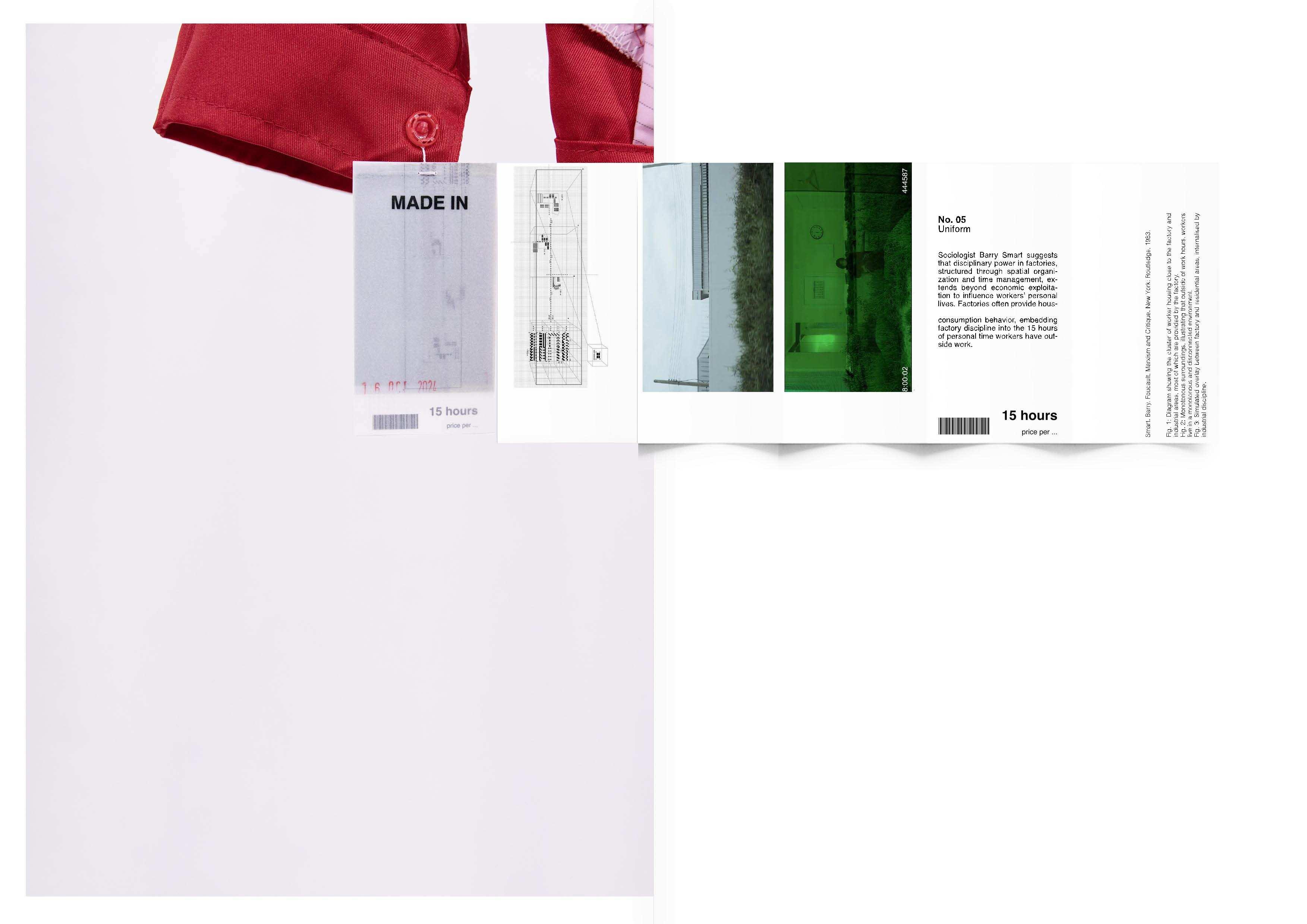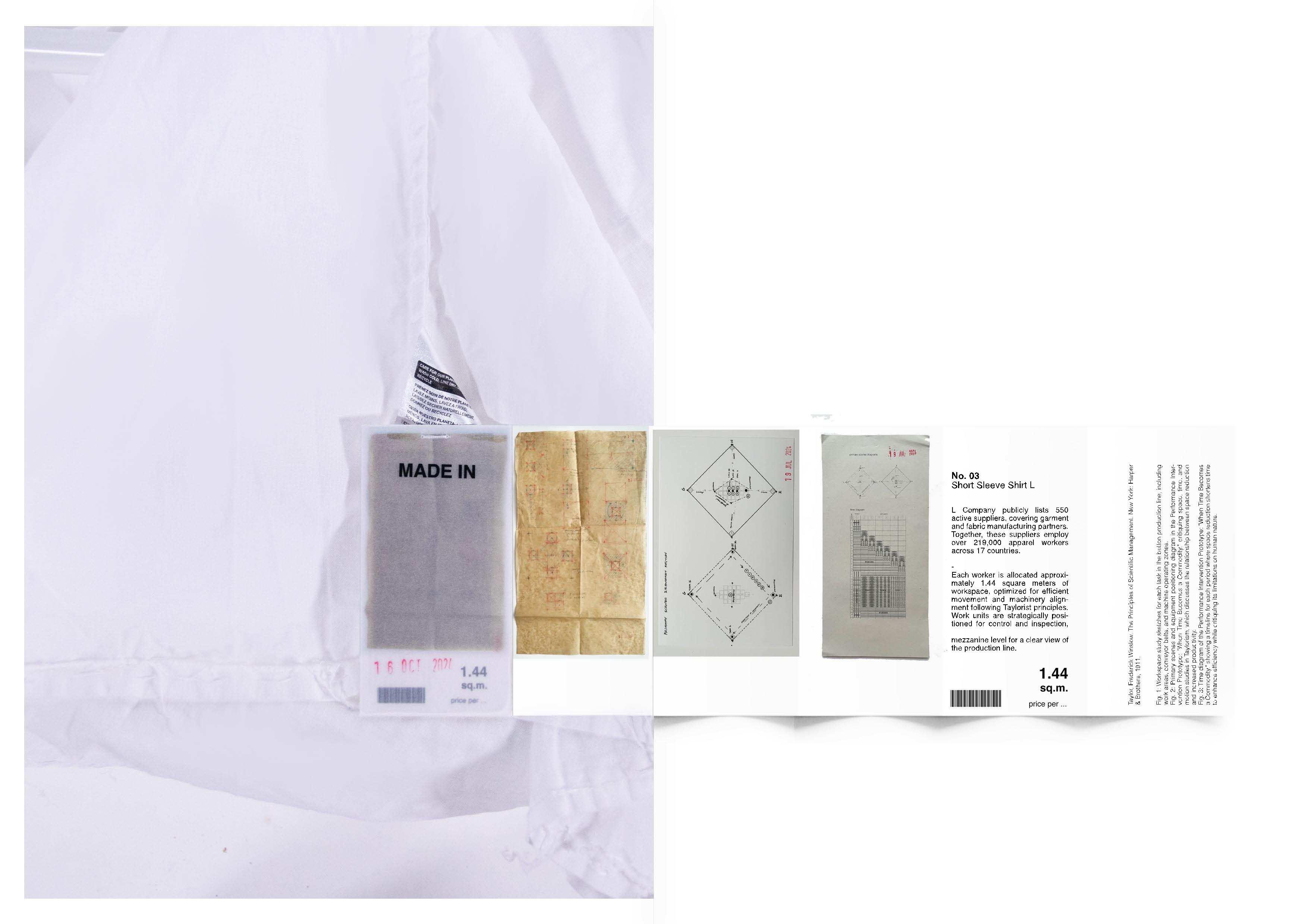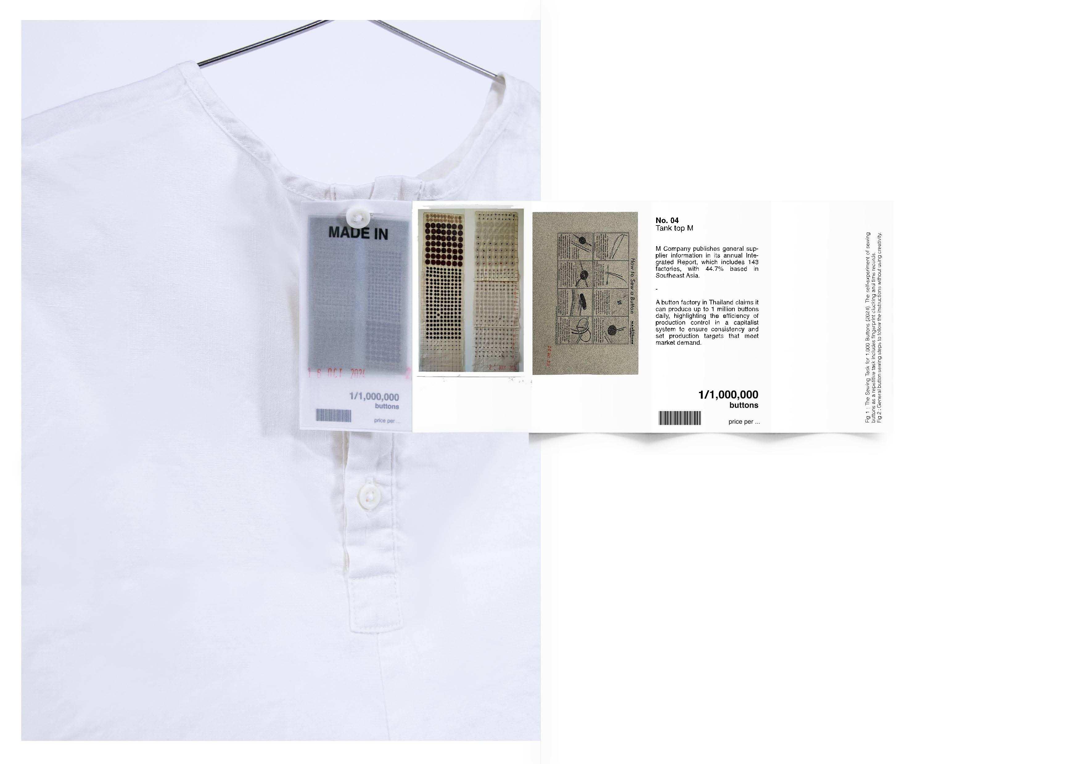 This series of labels, stitched into ten fast-fashion garments, brings attention to the exploitation underlying these items. Instead of presenting a monetary price, the labels reveal the labor and discipline embedded in their production. Each label reflects the working conditions and factory control that contribute to these garments, inviting a re-evaluation of value within the clothing industry. The collection is paired with archival materials exploring the significance of garment labels, along with data linking specific factories that produce auxiliary components for various clothing brands.
