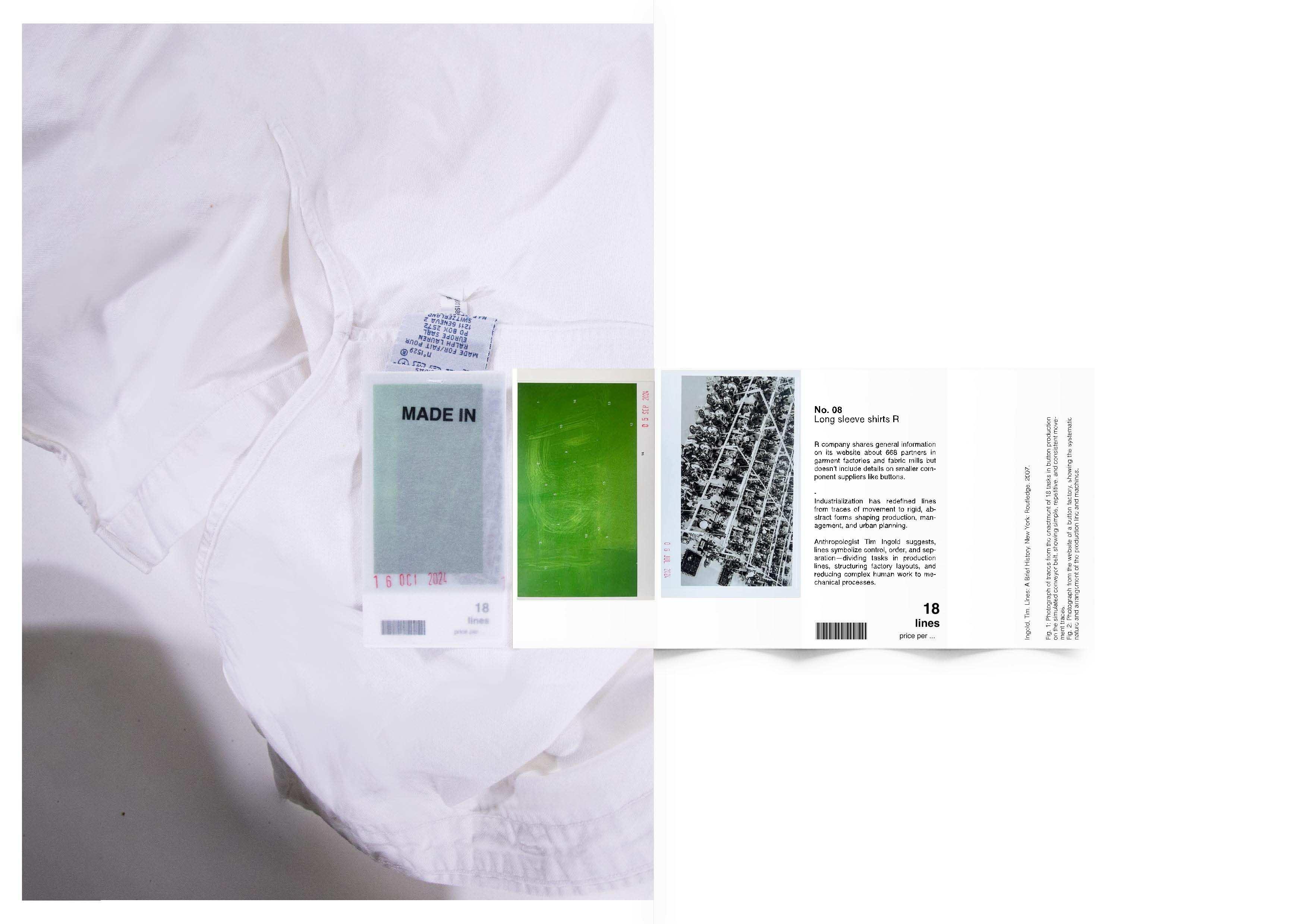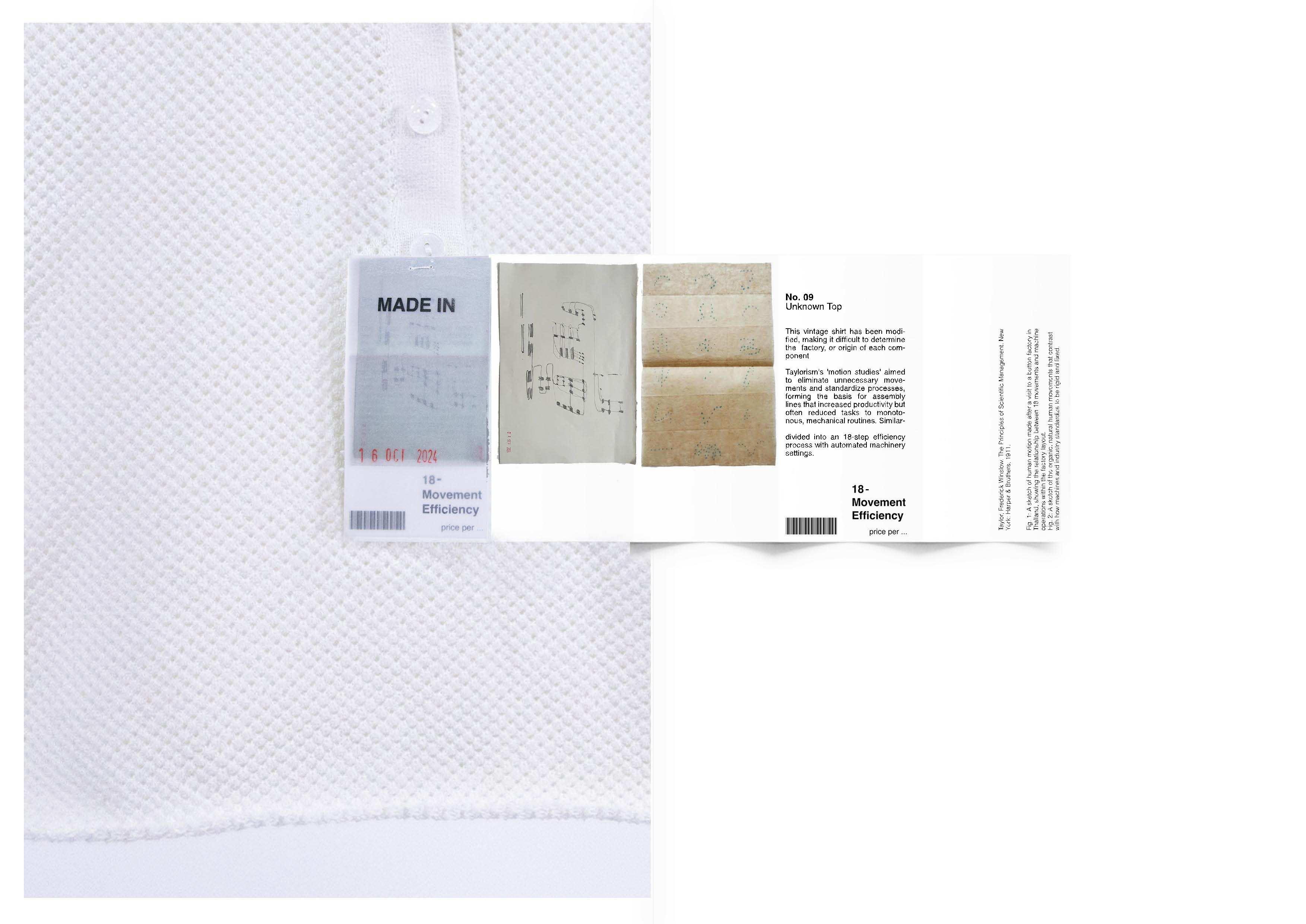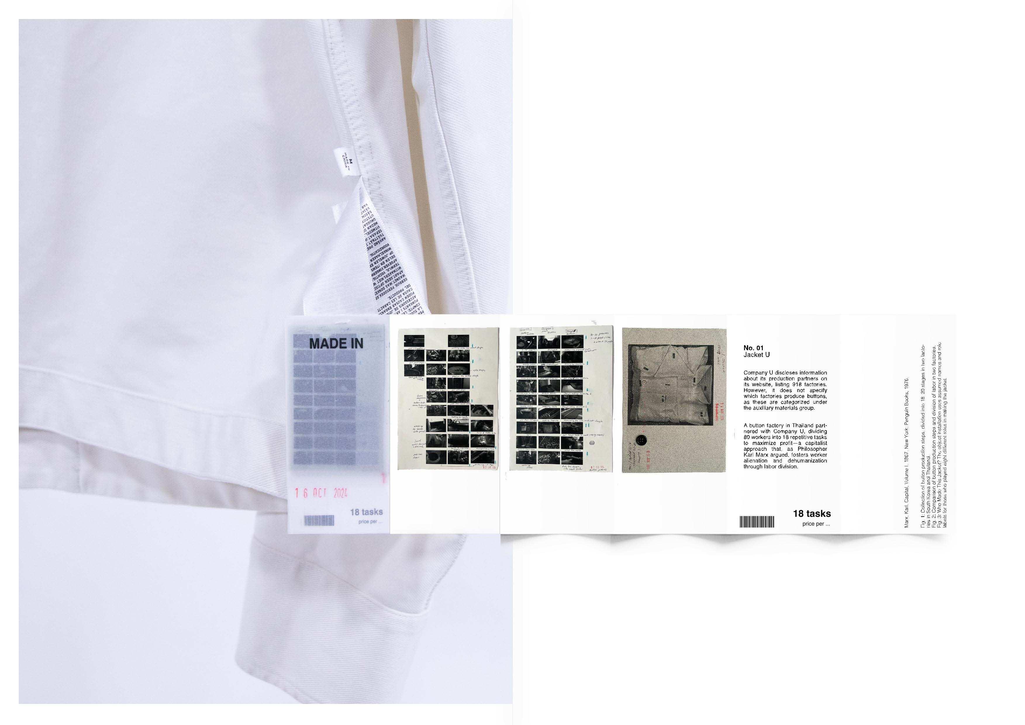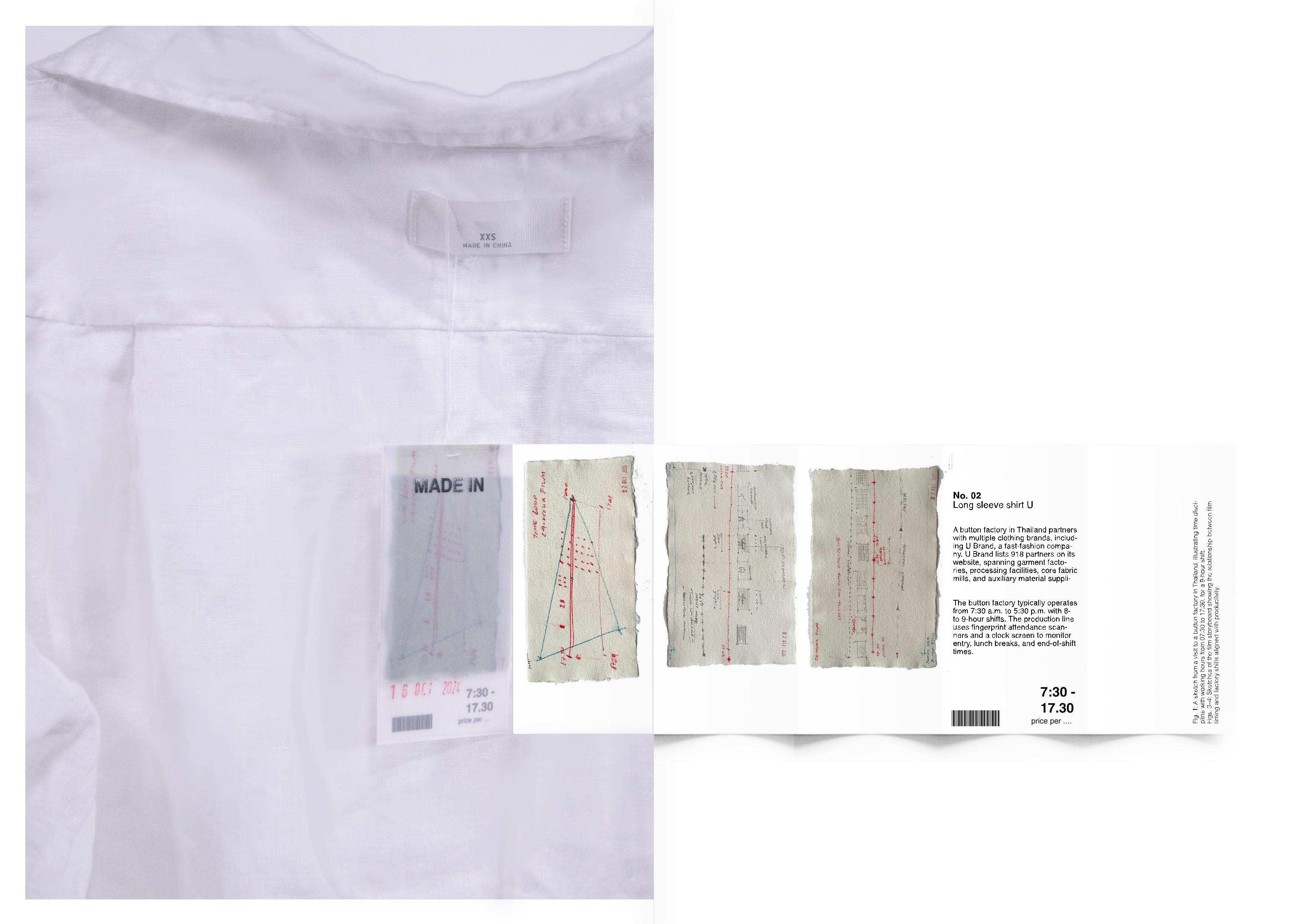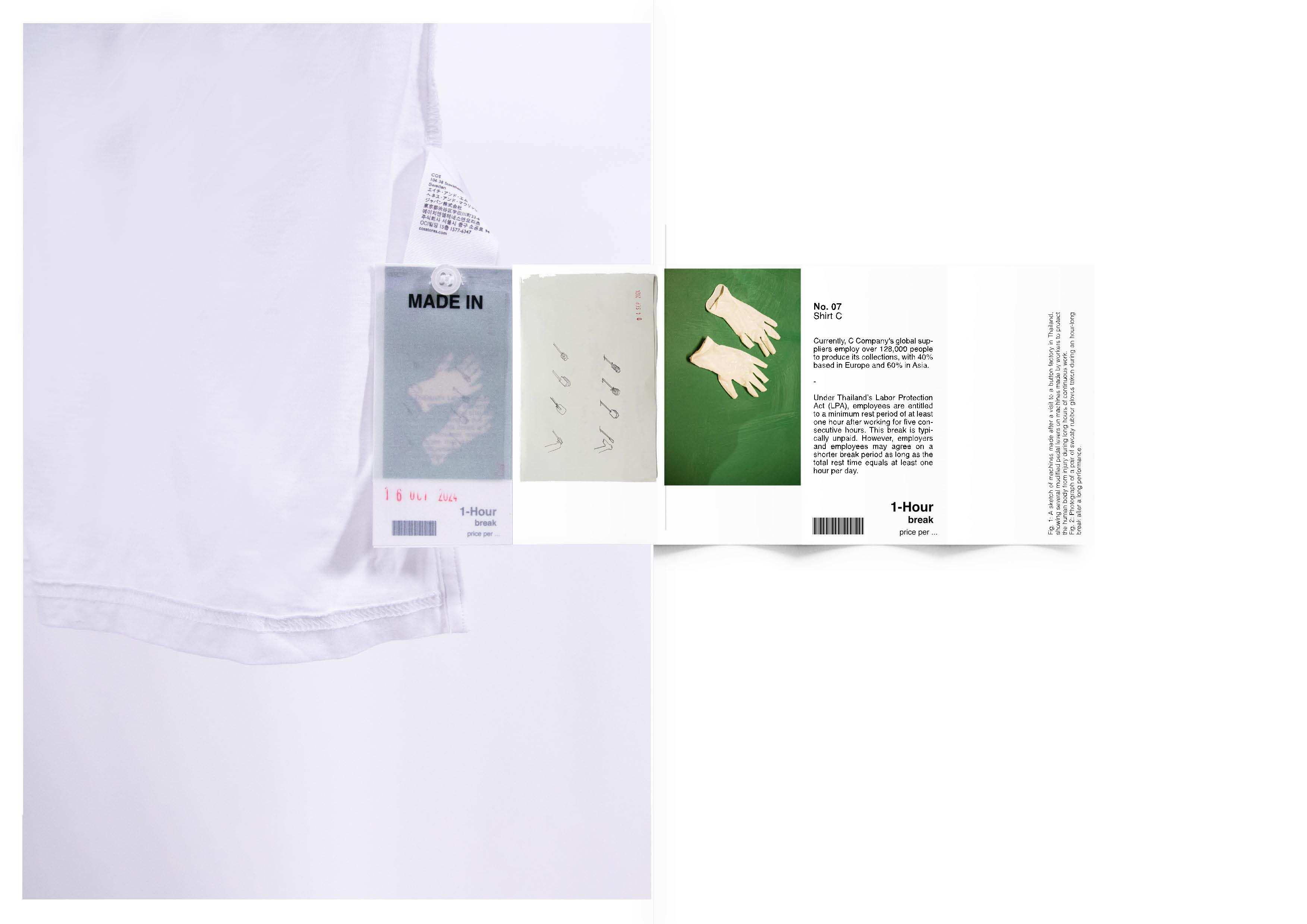 This series of labels, stitched into ten fast-fashion garments, brings attention to the exploitation underlying these items. Instead of presenting a monetary price, the labels reveal the labor and discipline embedded in their production. Each label reflects the working conditions and factory control that contribute to these garments, inviting a re-evaluation of value within the clothing industry. The collection is paired with archival materials exploring the significance of garment labels, along with data linking specific factories that produce auxiliary components for various clothing brands.