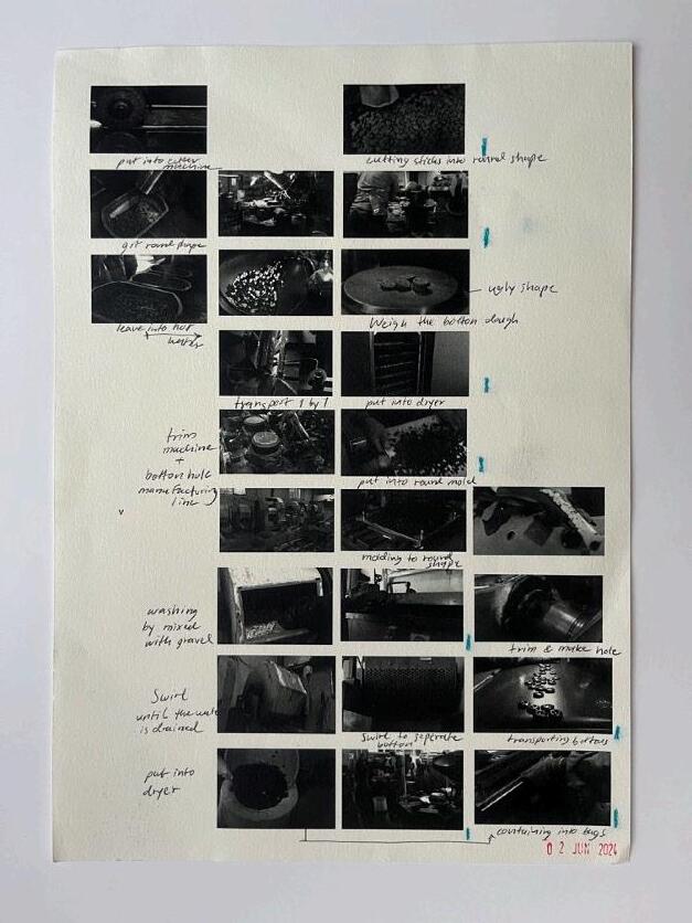 Draw the Lines explores and critiques labor alienation within a key component of the clothing industry: button production. The site of study is a medium-sized button factory in Bangkok, Thailand, employing approximately 80 workers and producing buttons for both domestic sale and export. Participant observation through on-site visits was essential for gathering data on the physical aspects of the factory’s interior, the relationships and interactions among workers, the structured activities on the production line, and the surrounding context. Due to regulations prohibiting photos and videos in the production area, data collection relied primarily on sketches and detailed notes.
