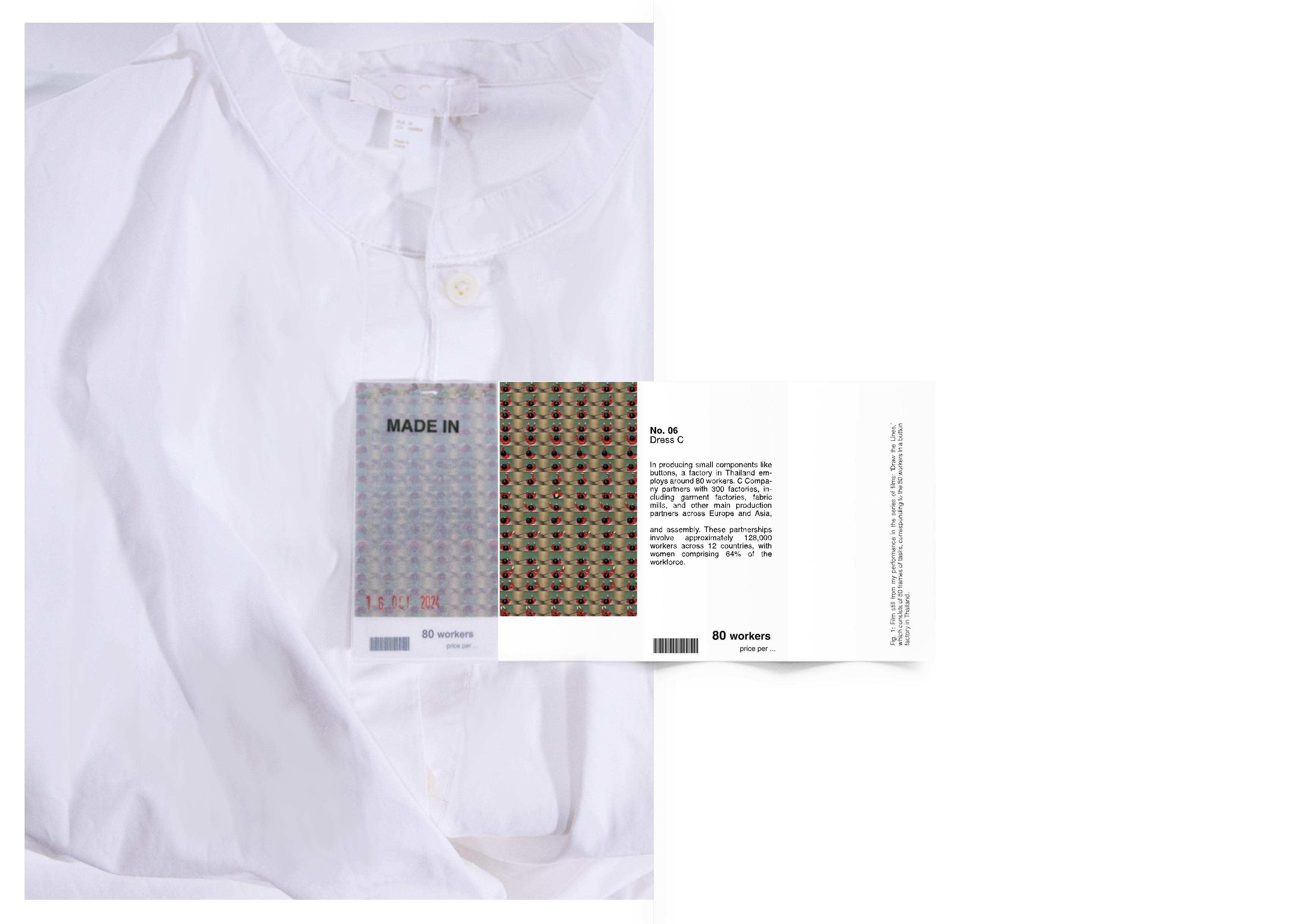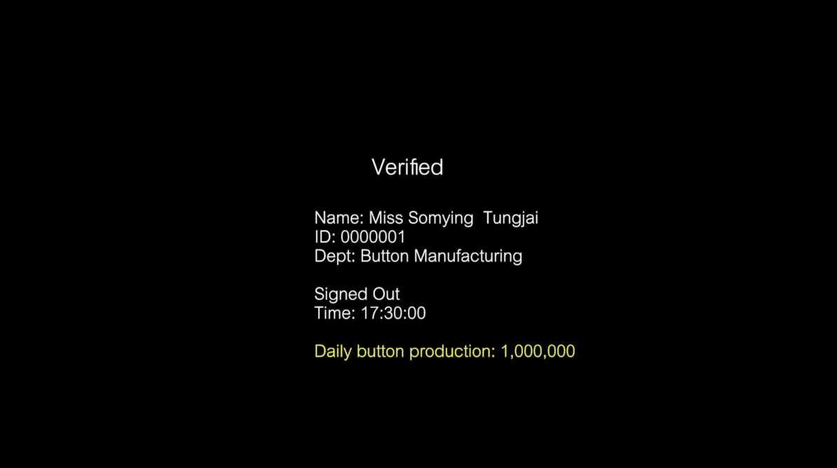 A 10-hour film documents a durational performance in which I monotonously repeat bodily movements from a 9-hour work shift of a Thai button factory's production line, which I visited and observed under the constraints of efficiency, space, and time. An 8-minute cut intersperses footage with process-oriented experiments which highlight the influence of factory control extending into workers’ lives. Finally, a set of clothing labels stitched into fast-fashion garments reveal the nature of exploitation associated with specific items available in high street stores worldwide to prompt consumer awareness.