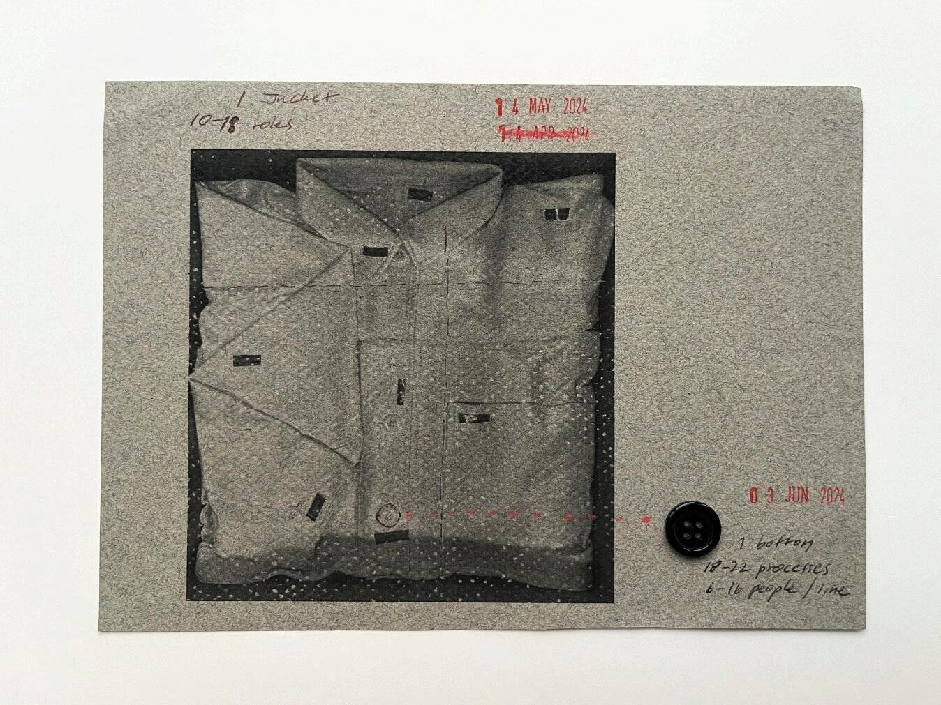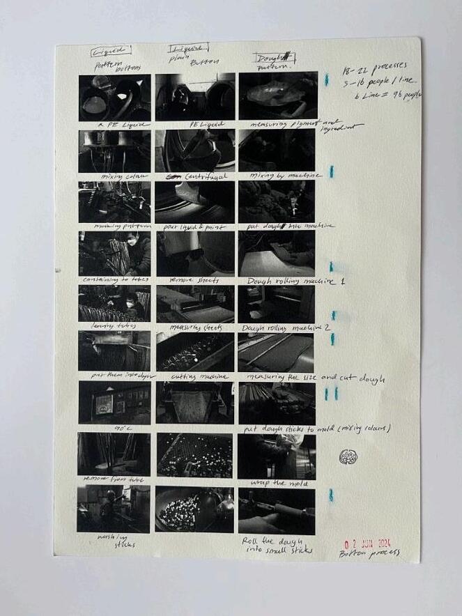 Draw the Lines has been developed and presented as a tripartite series of works that explore the alienation of workers under spatial and temporal discipline, specifically in the context of production lines in a Thai button factory. This exploration unfolds through three distinct pieces: Draw__ the Lines, A 10-Hour Film, The Unbuttoning, An 8-Minute Film, and Auxiliary Materials, a set of clothing labels. Each piece examines the intersection of labor, time, and surveillance from a unique perspective.
