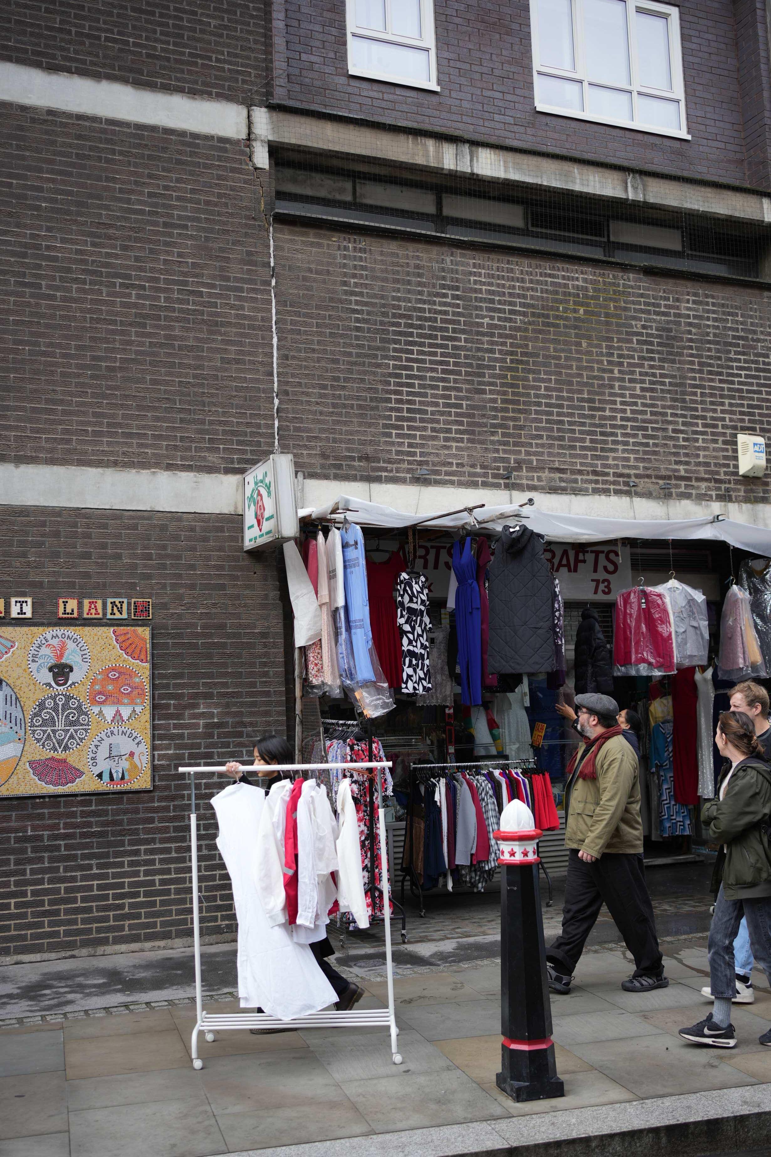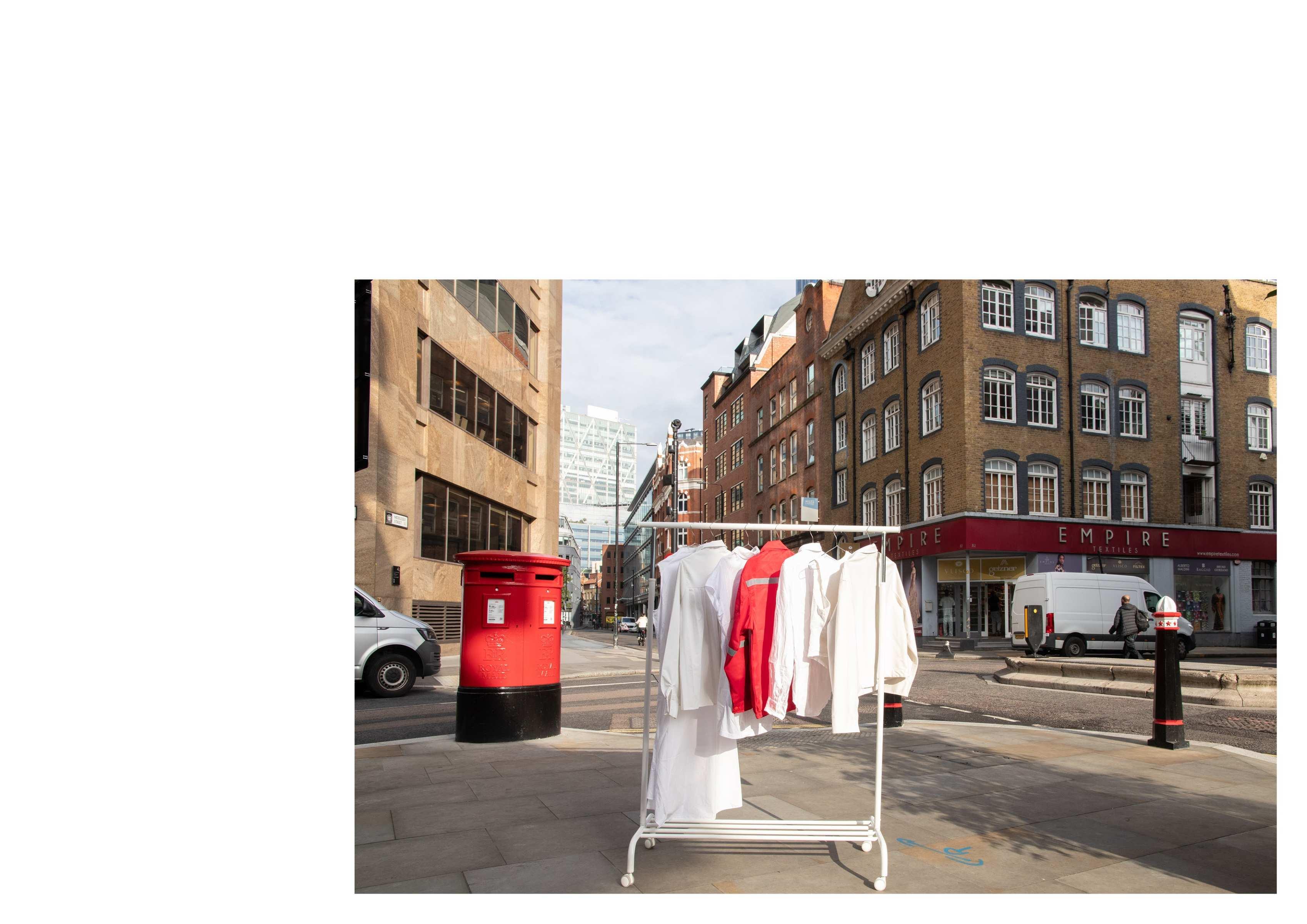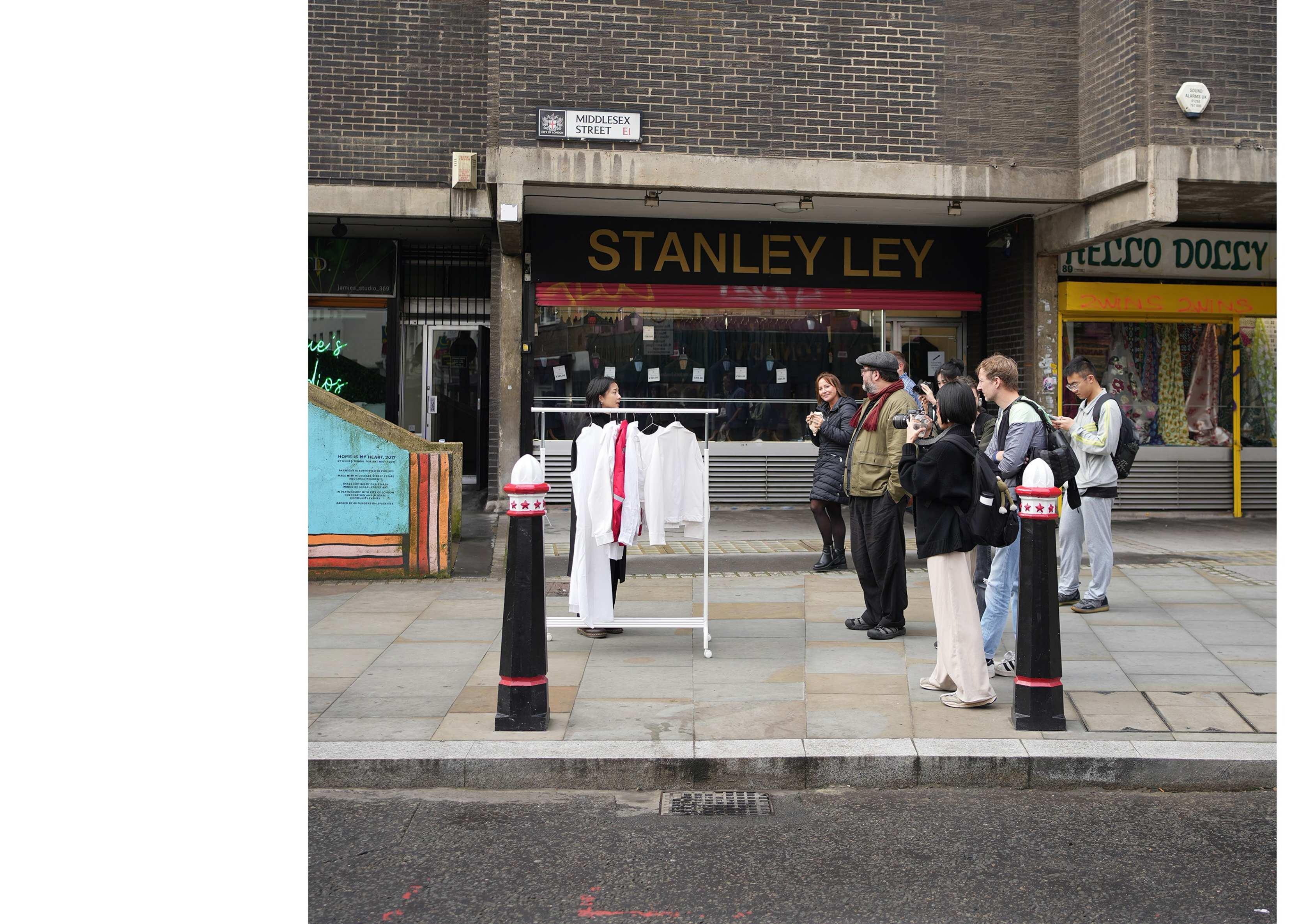 The Live Intervention at Petticoat Lane Market takes place at a major clothing market with over 1,000 stalls along Middlesex Street. This interactive walking tour begins at the heart of the market with a mobile clothes rack, guiding the audience through both street stalls and store displays. The goal is to provoke questions about the origin of clothing, the individuals involved in its creation, and the often-overlooked layers of labor exploitation in affordable clothing industries.