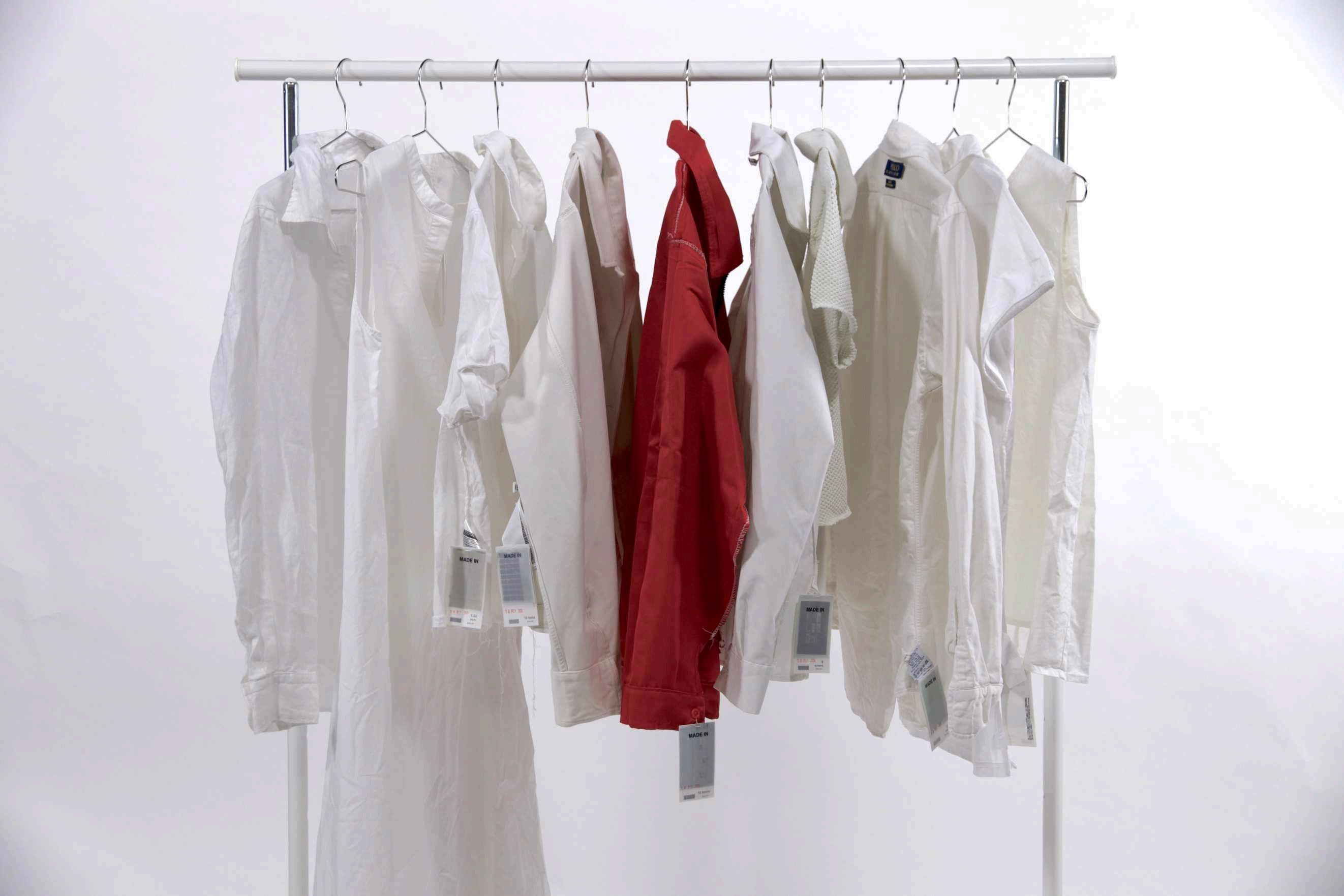 Fig 34: Photograph of a clothing rack containing 10 labels stitched into 10 garments