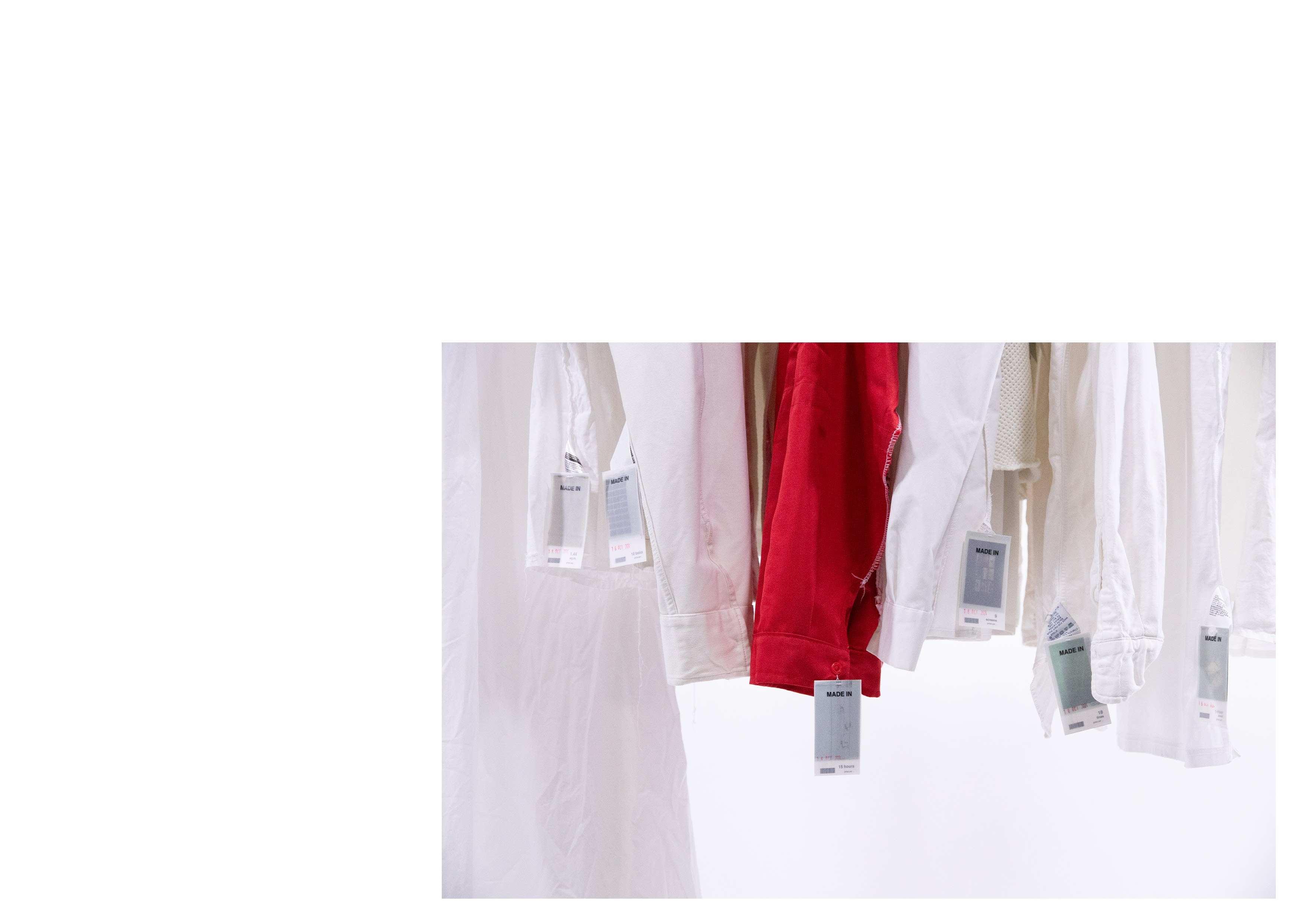 During the intervention, the audience is invited to search for labels hidden within garments on the racks, turning them inside out to uncover details about the labor behind each piece. Each label contains information about the labor involved, coupled with archival materials to reveal the often-overlooked exploitation in garment production, including components like buttons and labels. This intervention encourages participants to critically consider the impact of their clothing choices within a system built on labor exploitation, emphasising a deeper understanding of how mass consumption perpetuates these conditions.