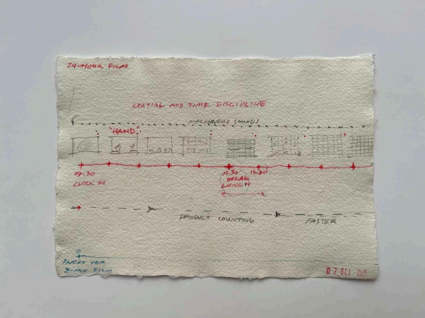 Fig 20-21: Sketches of the film storyboard showing the relationship between film timing, factory shift time, and outside work time in alignment with button productivity