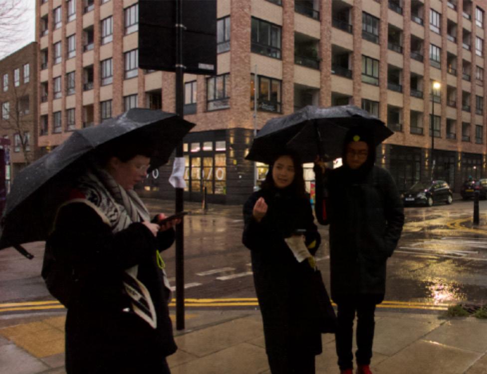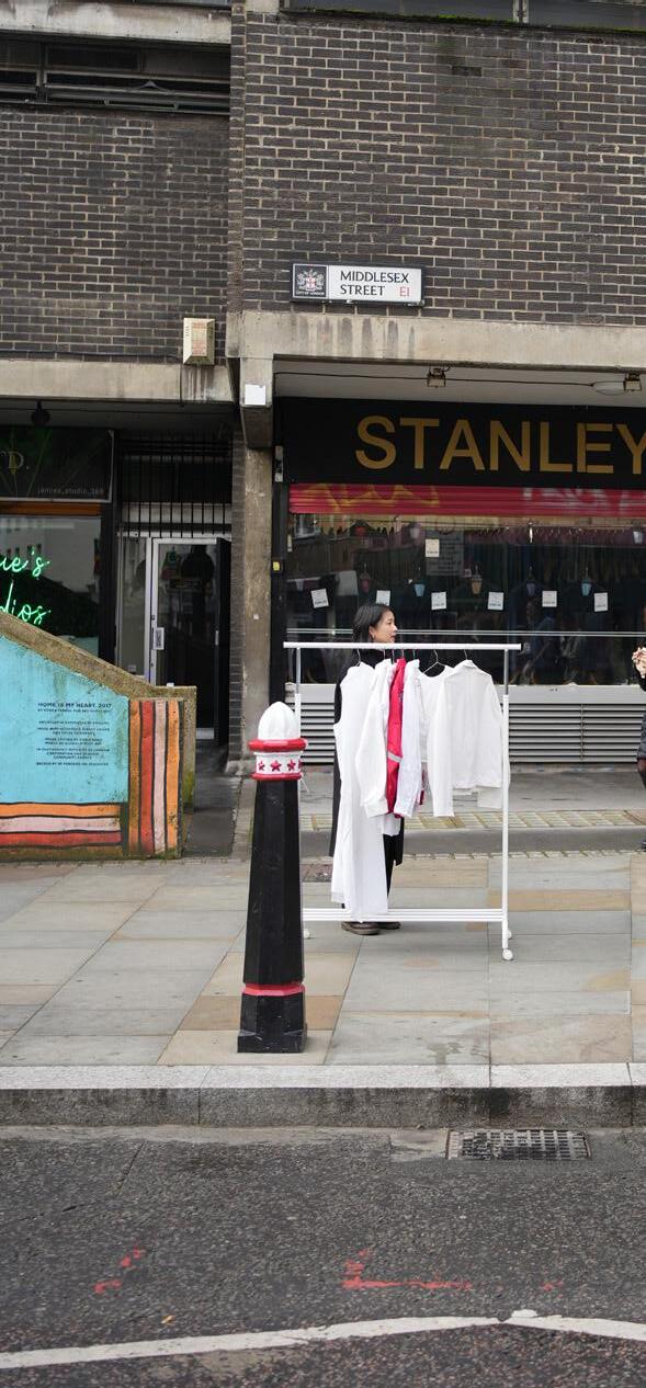 The live public intervention unfolded as a guided walking tour through Petticoat Lane Market. Using a mobile clothes rack, participants were invited to turn garments inside out to uncover the stitched labels. This act transformed spectators into investigators, confronting the overlooked layers of labour exploitation in affordable clothing industries. The work reframed value in fashion, prompting reflection on how consumption is bound to systemic exploitation.