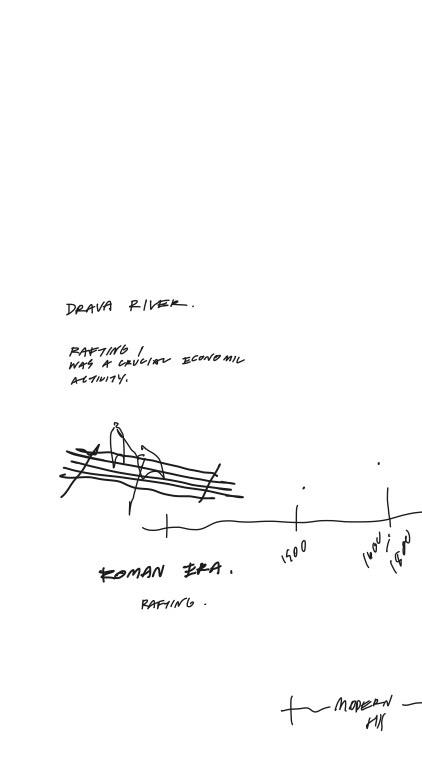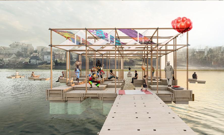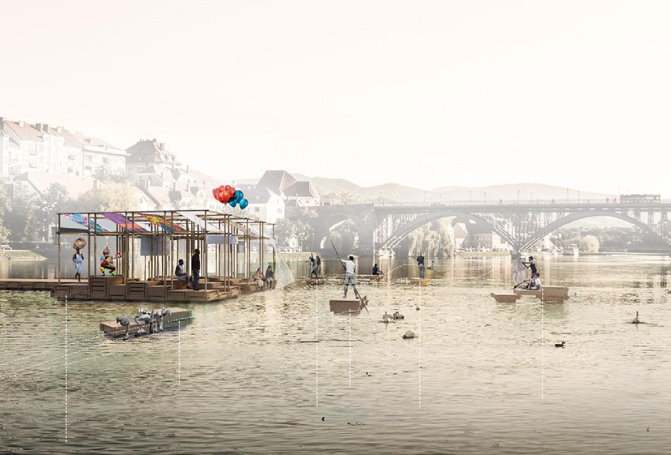 Pigments of an Era is a floating pavilion that reinterprets the memory of rafting on the Drava River in Maribor, a tradition once vital to the town’s growth and identity. As water and time flow, the work reflects on transience, tracing how ways of life fade yet persist in spirit. Rather than reconstructing the past, the pavilion uses architectural form to evoke movement and continuity, bridging history with future adaptability while creating a shared space for reflection and community engagement.