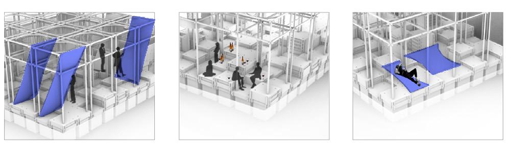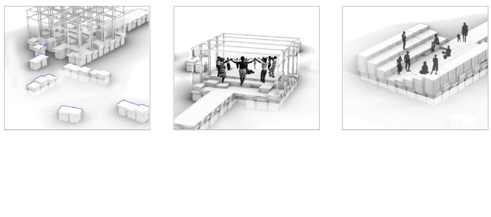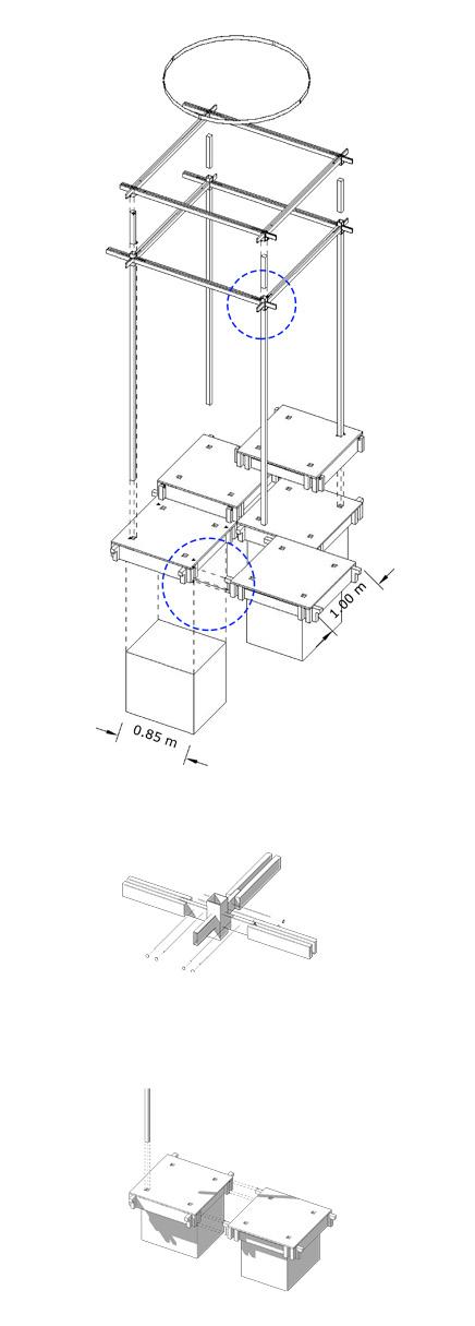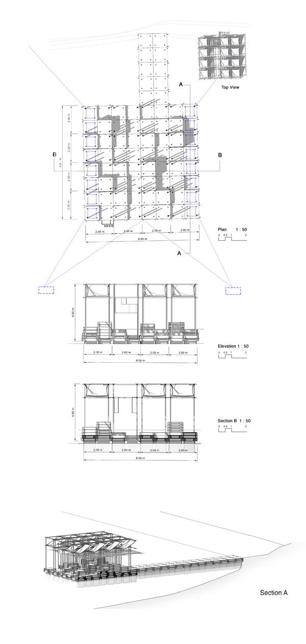 The pavilion consists of 64 modular raft units (1x1 m) that float independently and can be assembled into various configurations up to 8x8 m. Two structural systems define the design: a wooden–aluminum column and roof system with adjustable heights (2–4 m) and a modular wooden flooring system over a floating platform. The adaptable layers support different uses, from exhibitions to public gatherings.
