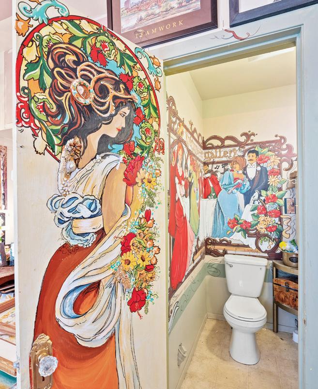 During COVID, she began painting a series of stylized women on the bathroom doors, inspired by the artistic style of Alphonse Mucha—who became famous for his Art Nouveau illustrations during the turn of the 19th century.