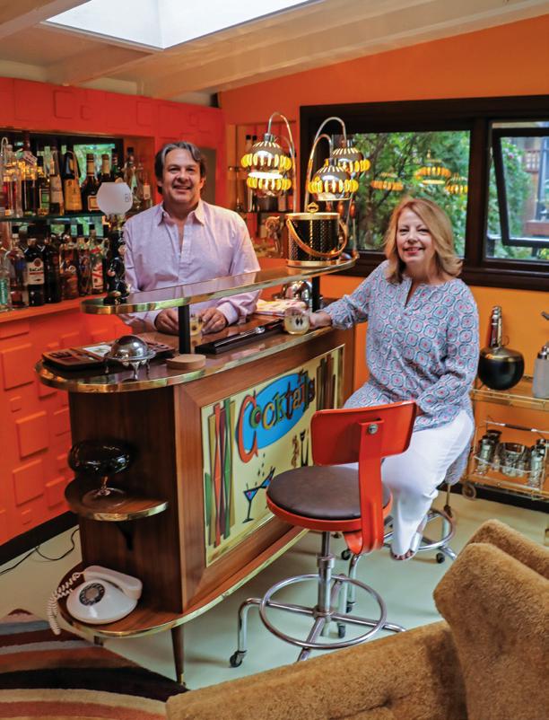 “We replaced our china cabinet with an authentic MCM teak cabinet,” says Perry. “We replaced our cocktail bar. It’s important to be true to the period when we can, and we do that with Mid-Century barware,” he adds. “We’ve grown an exceptional collection of period sets.” The search continues for authentic MCM bar stools, Holt Howard cherry and olive containers and black cat swizzle sticks.