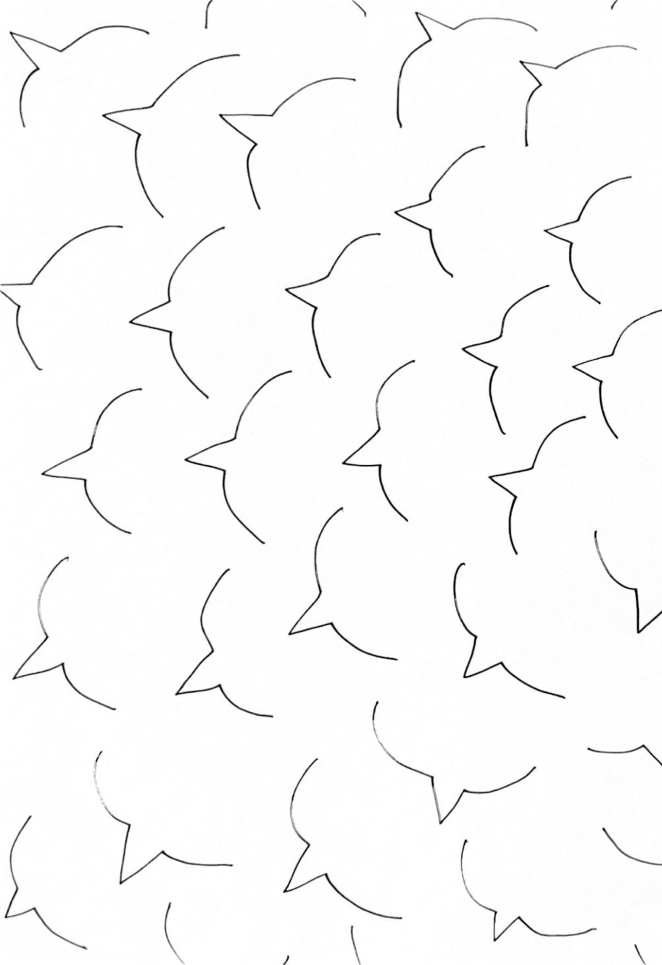 Covert’s stupa depicts Anuradhapura’s Buddhist Ruwanweli Maha Seya temple, built by Sinhalese king Dutugemunu in c.140 BCE, after defeating Tamil Chola king Elāra. Rajapaksa’s decision to swear his 2019 presidential oath at the site angered Thenuwara.11 Covert uses two-dimensional lines to emphasise political symbolism as a cultural practice that requires reduction or simplification alongside repetition to create impact. But for all that specific motifs recur throughout Thenuwara’s sculpture and drawings with an appearance that evokes the diagrammatic, his illustrated forms constantly threaten to overwhelm and collapse their neatly demarcated boundaries. Thorns spill into barbed wire, bodies slip into swords. Covert put pressures on the mechanisms that underpin militarism by unmasking its attempt to naturalise social divisions.